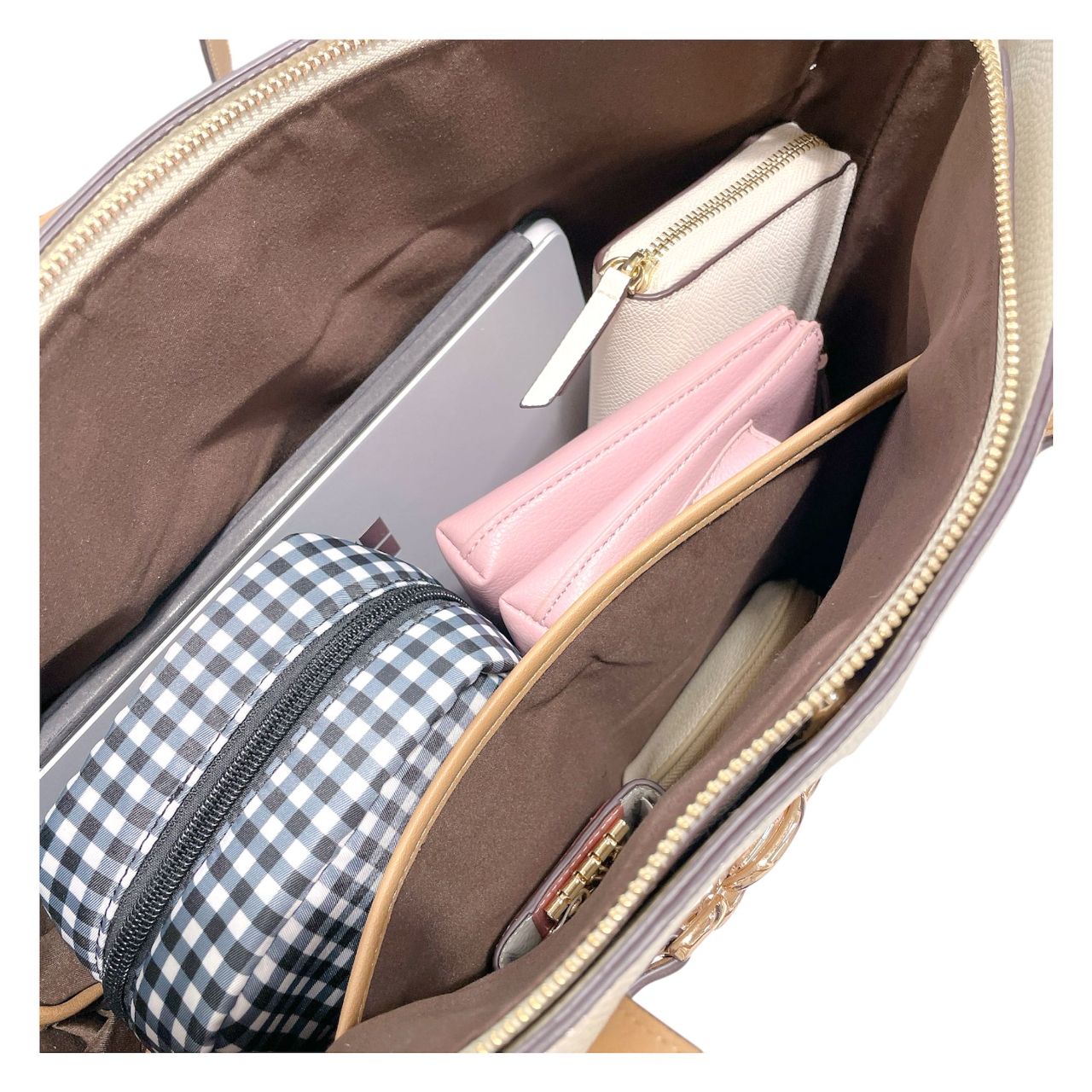 長財布、キーケース、コインケース、ポーチ、パソコンと嵩張る荷物もスッキリ収納できます◎