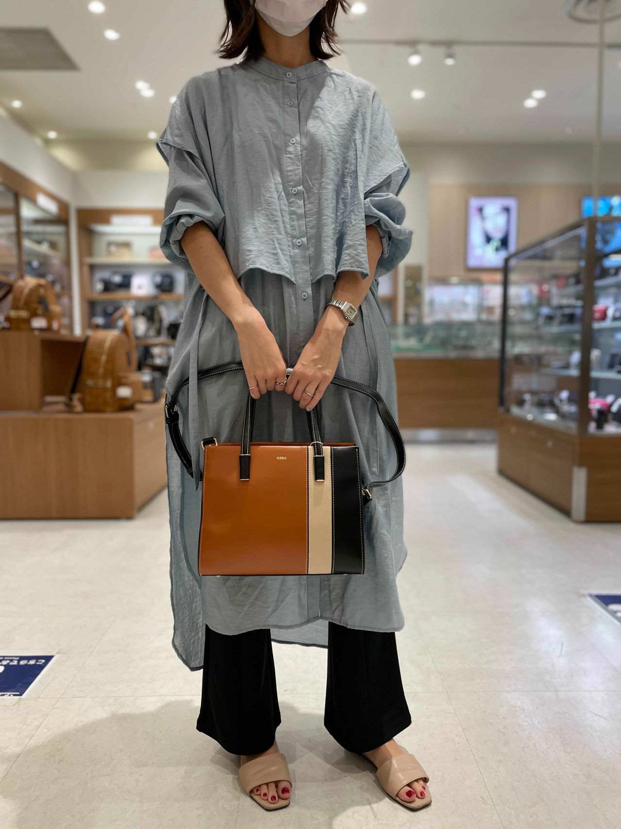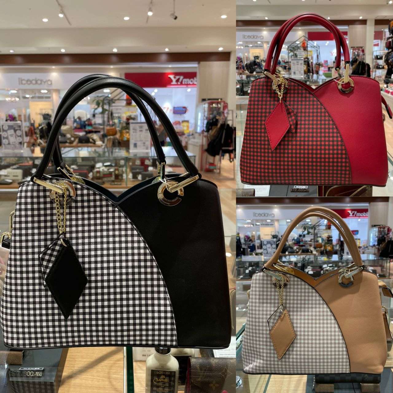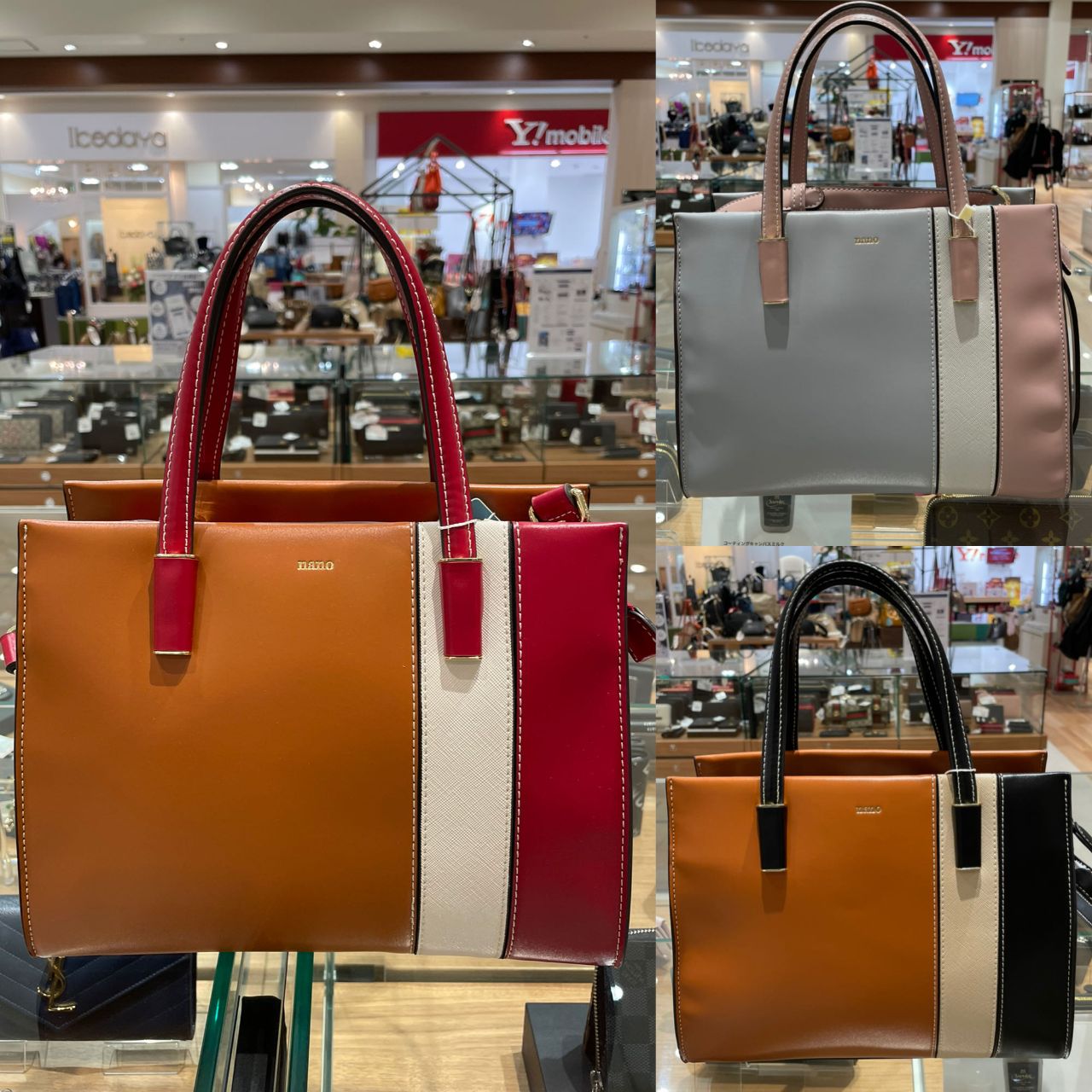 3色のトリコロールがおしゃれなハンドバッグ。