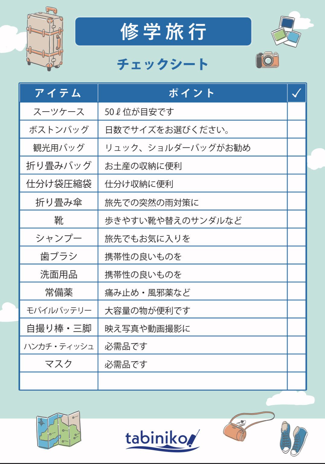 "修学旅行チェックシート"