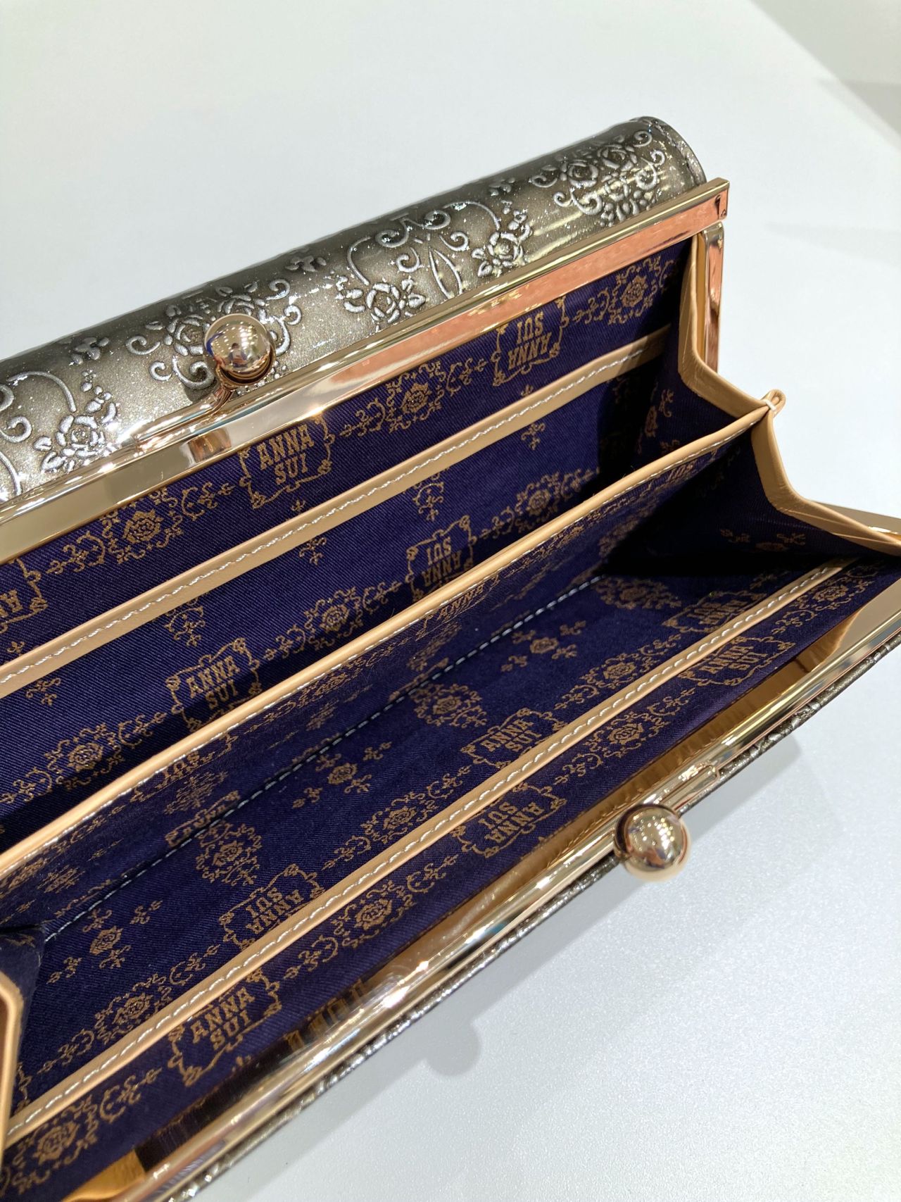 ダマスクローズ柄をエンボスエナメルで表現しており、手作業での色付け&極小ラメの吹き付けを施す事で、透明感のある独特な素材に仕上がっています♪