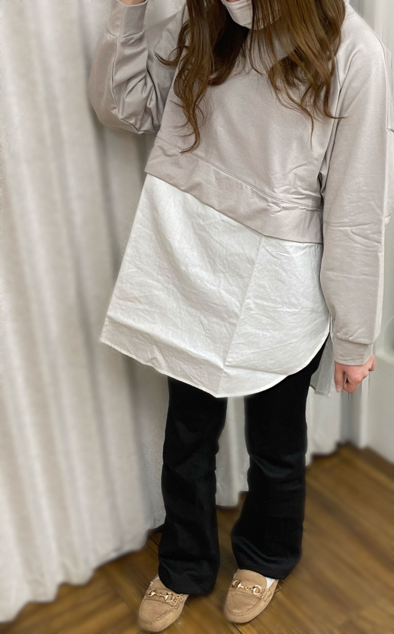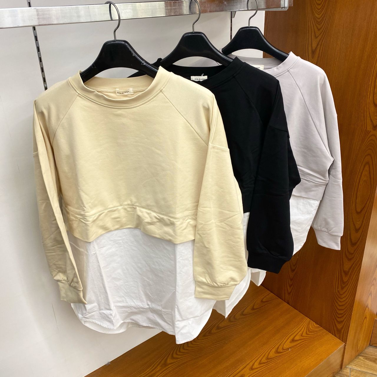 短丈のスウェットと長めのシャツを重ねたような、フェイクレイヤードでとてもお洒落です!