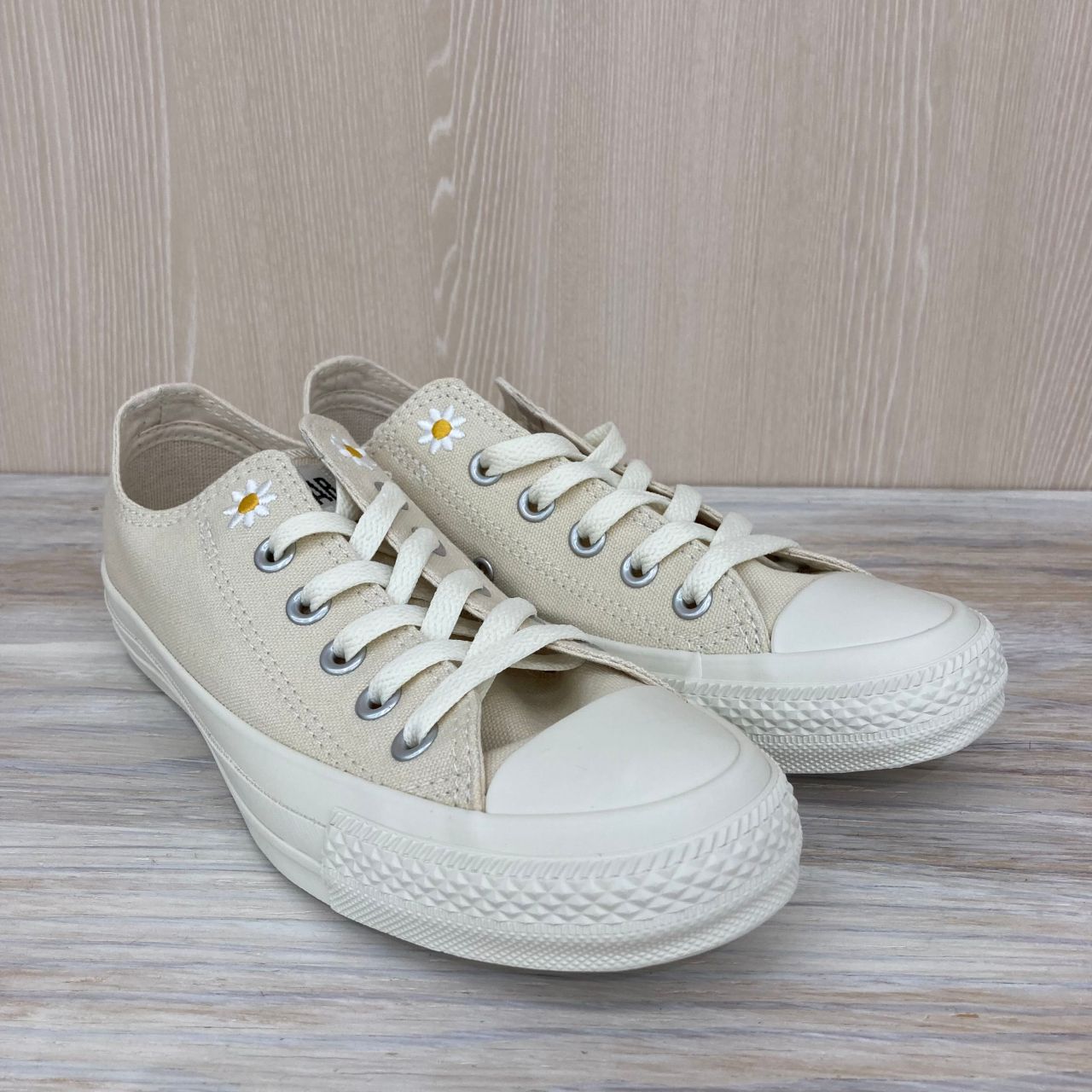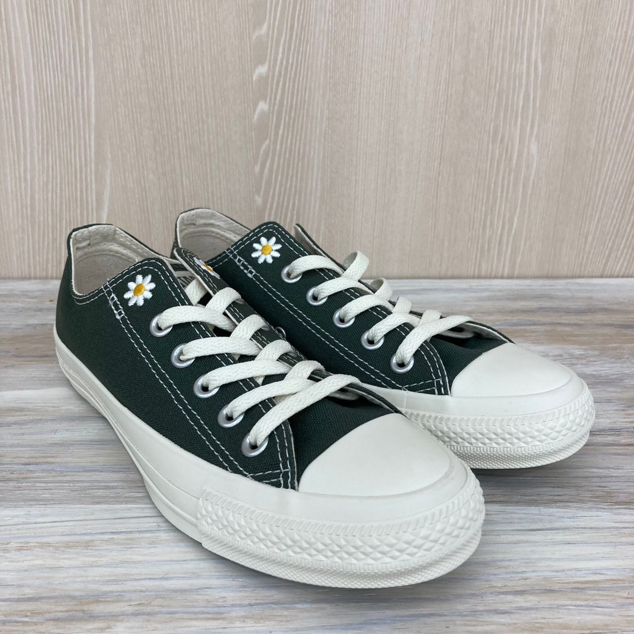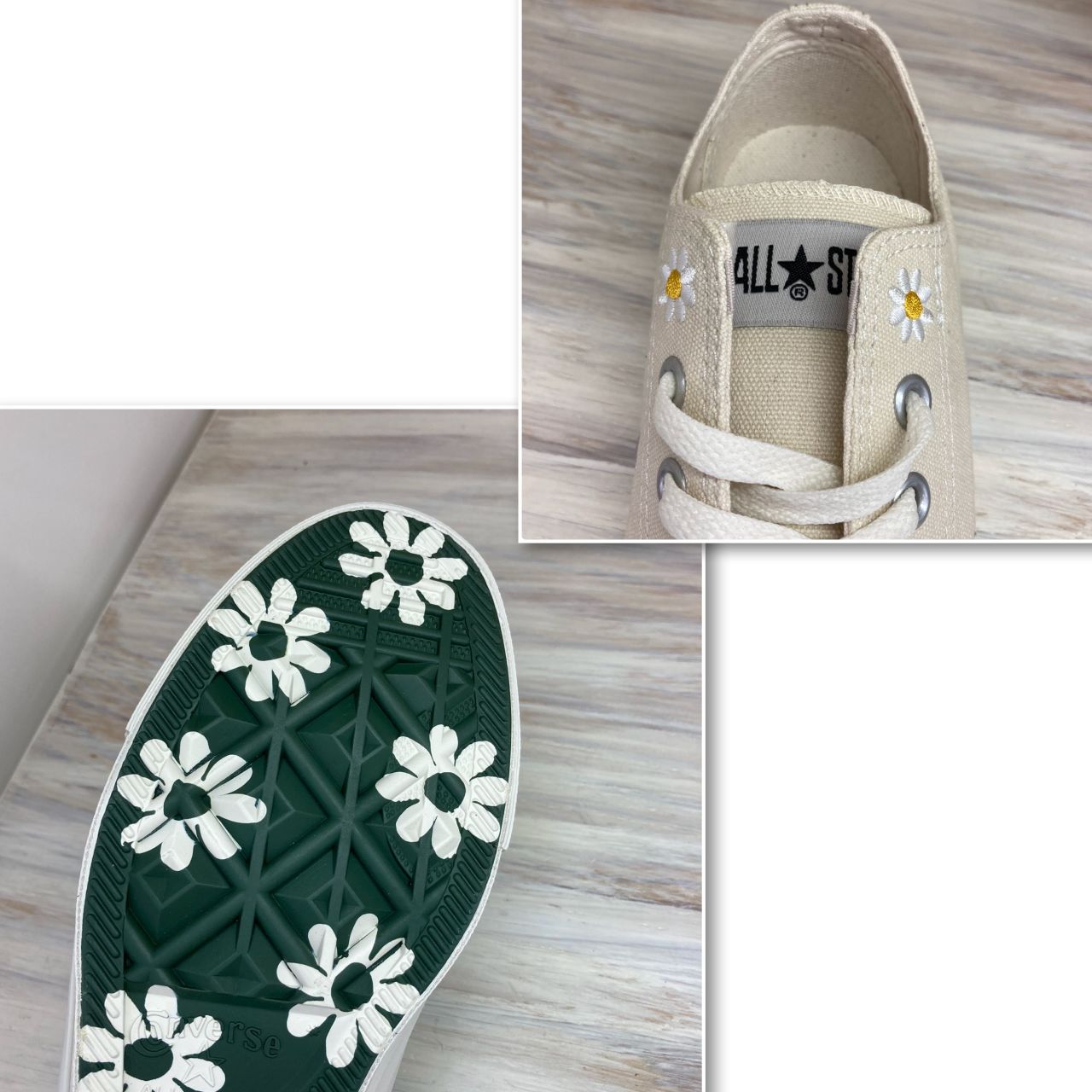 履き口部分のデイジーの刺繍と、歩行時にさりげなく見えるアウトソールの花柄がポイントです!