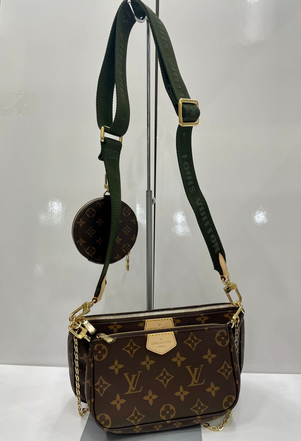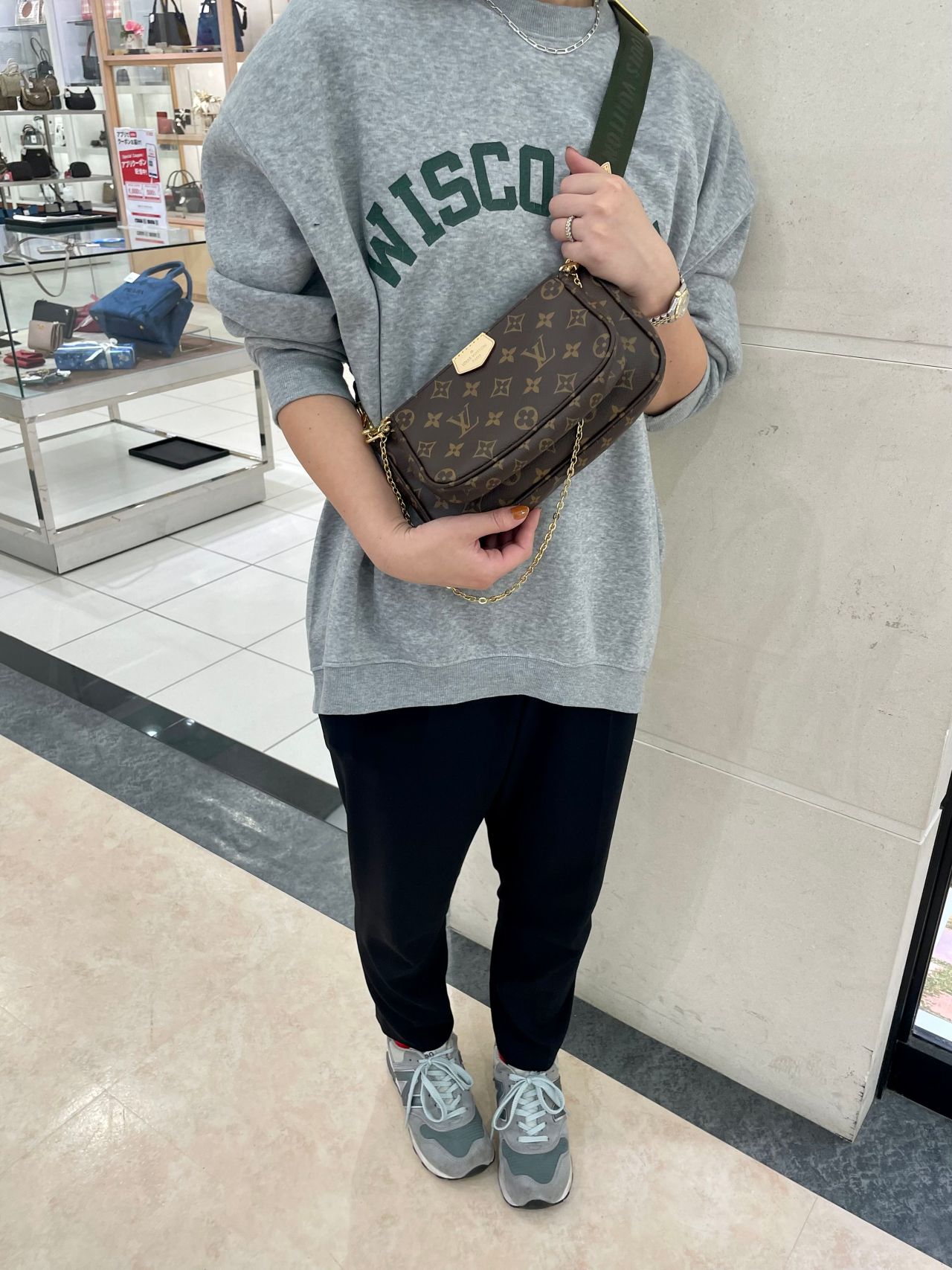 カーキとモノグラムの組み合わせが
