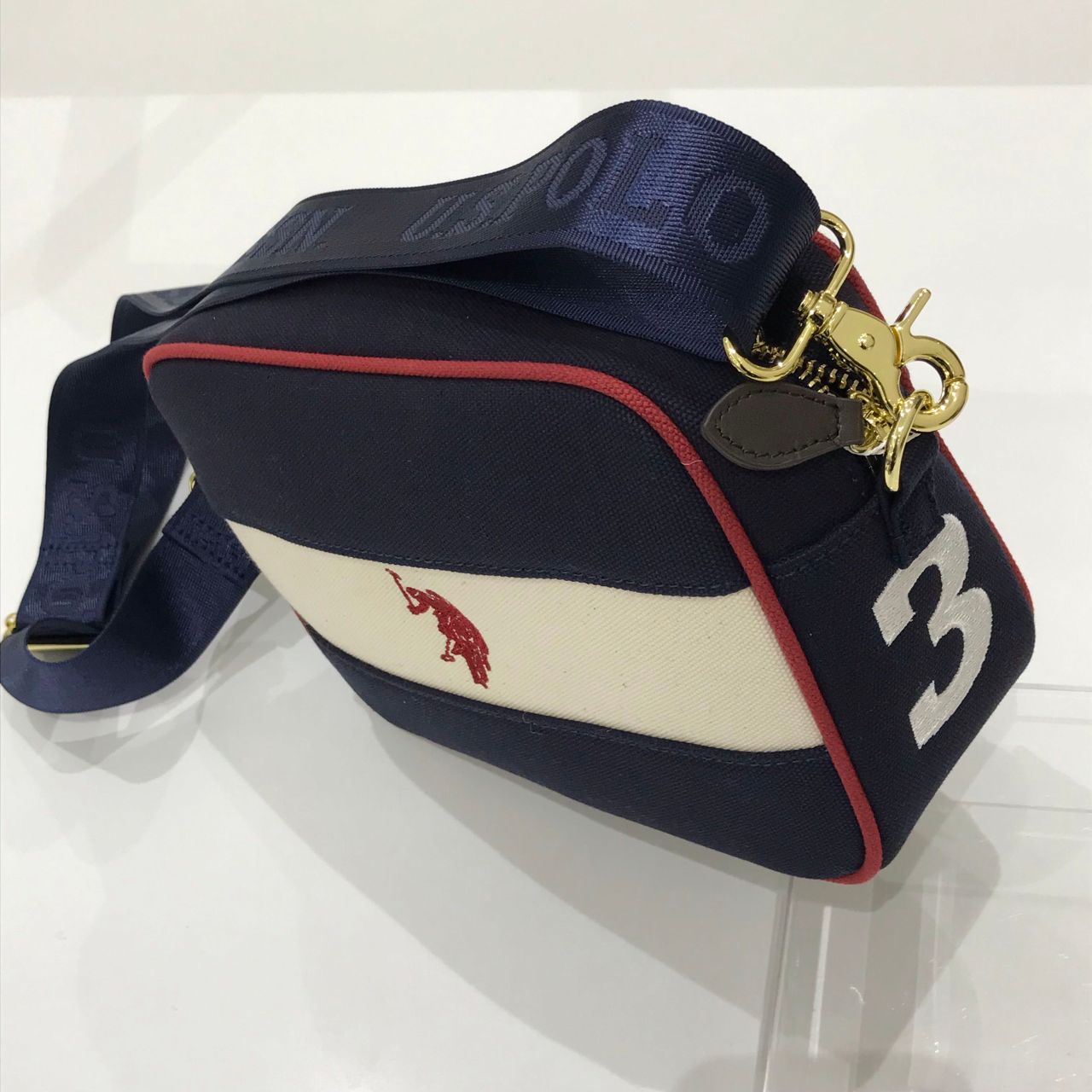 ロゴ入りのショルダーストラップが