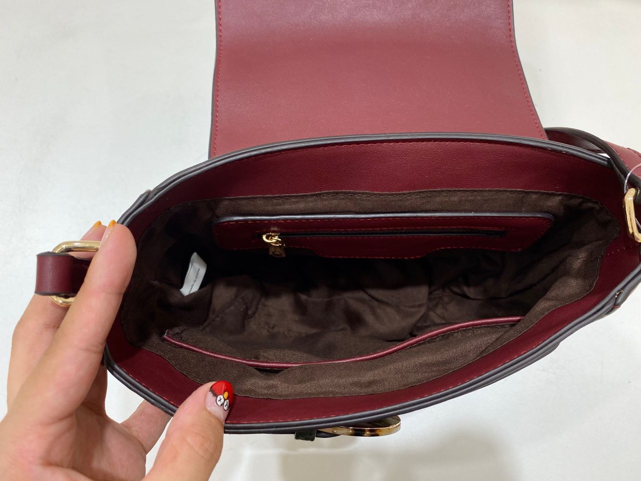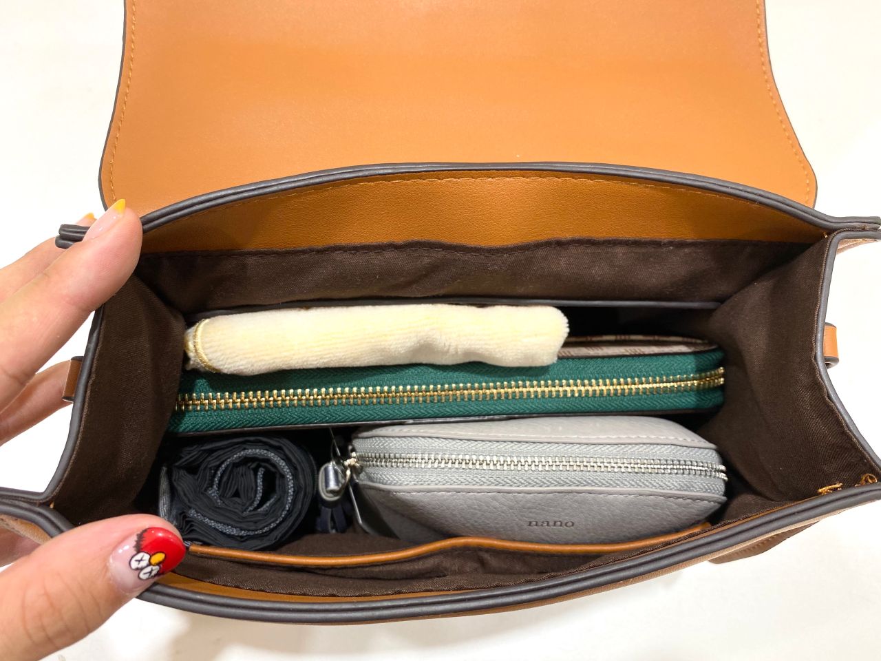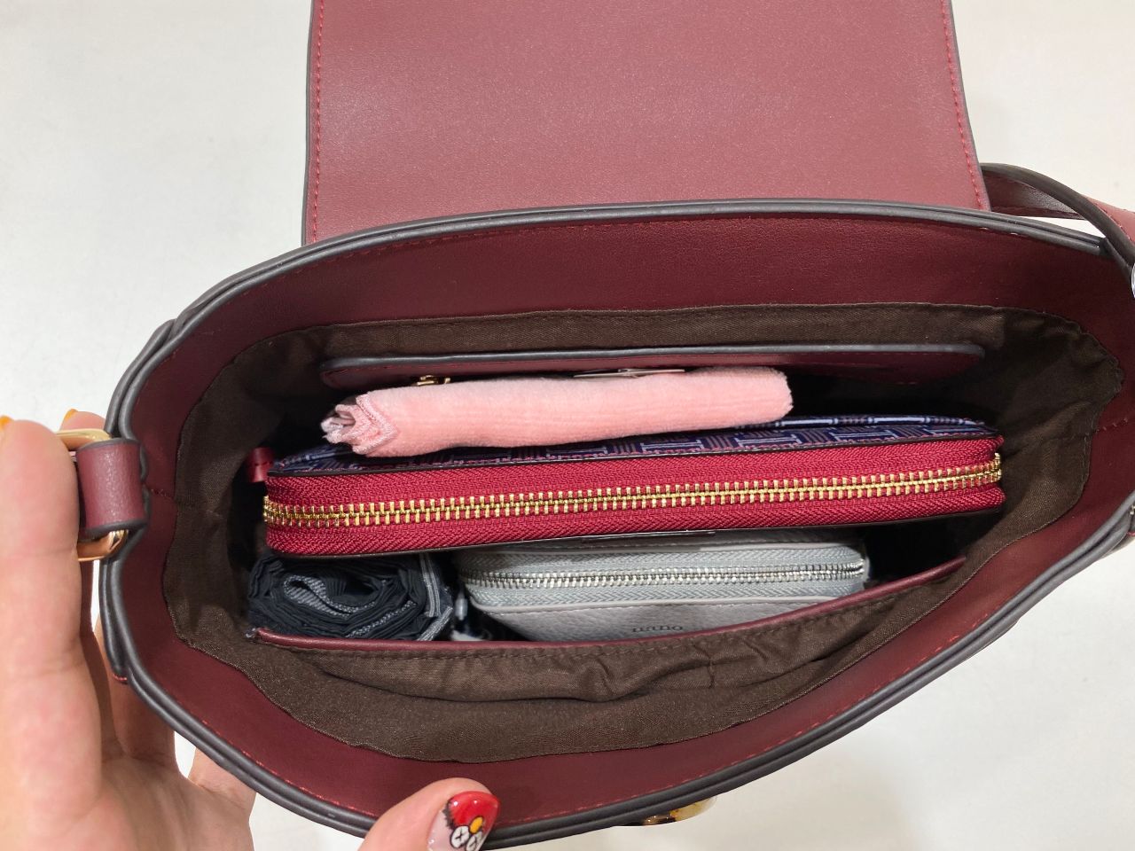 長財布もぴったりおさまり、小さいポーチ、エコバッグ、ハンカチが入るくらいの容量です。