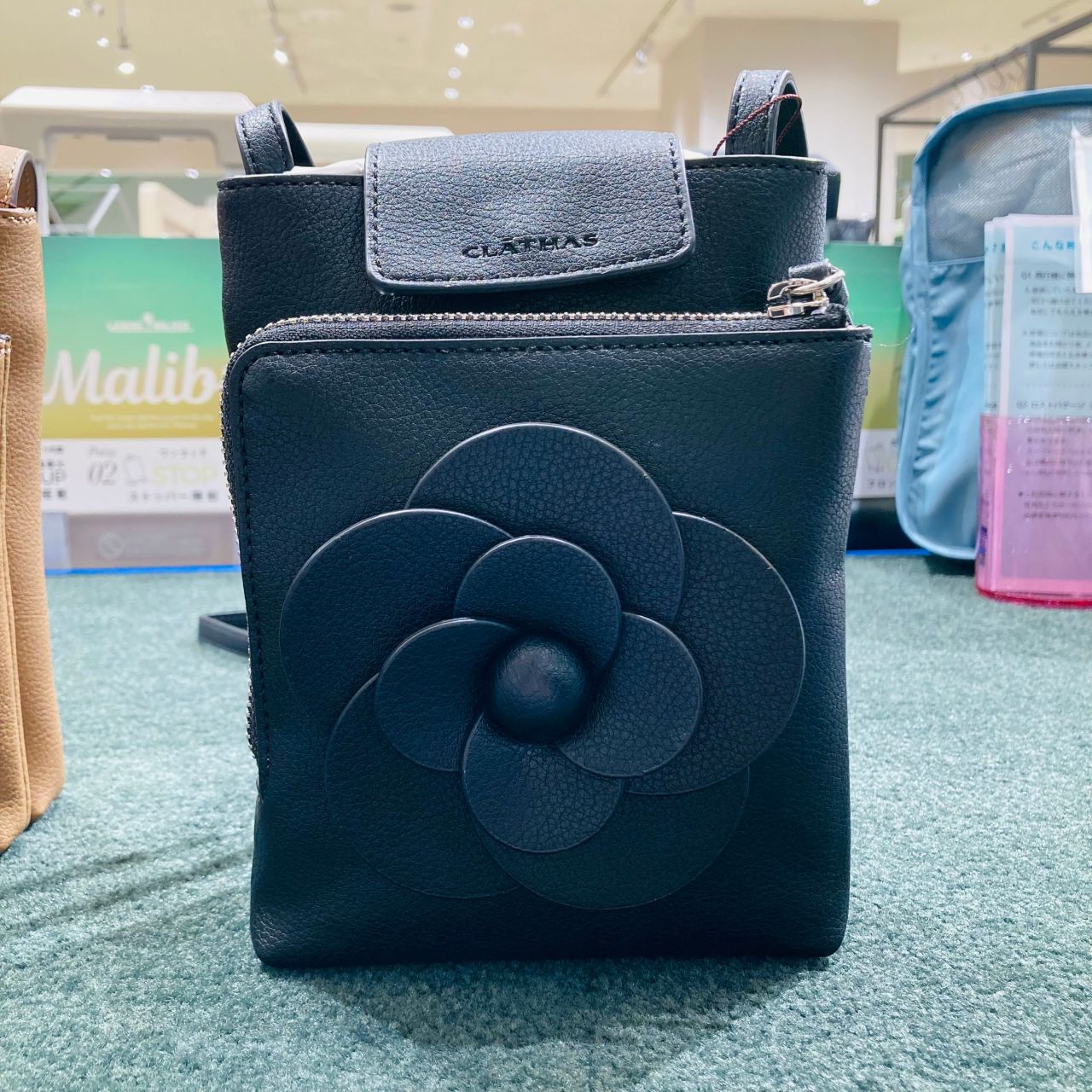 ボディと同素材で作った立体的なカメリアがポイントのショルダーバッグ。