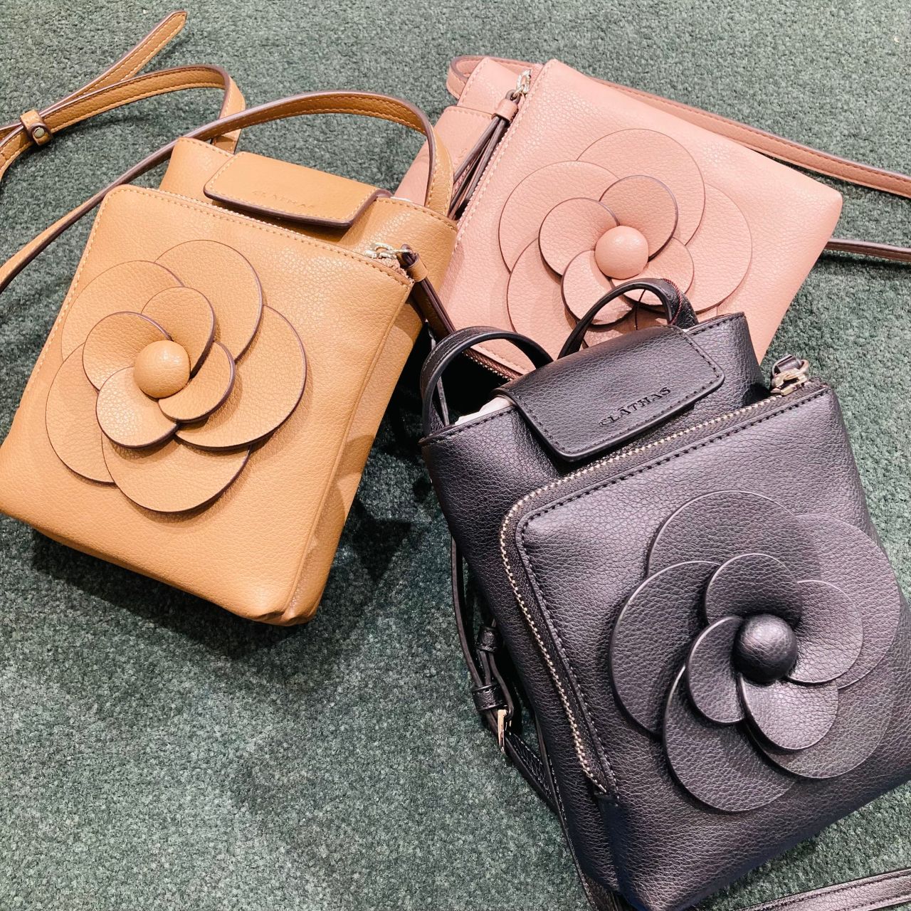 正面に大きなカメリアを施しており、カメリアがアクセントになっているので普段のコーディネートのワンポイントにも◎
