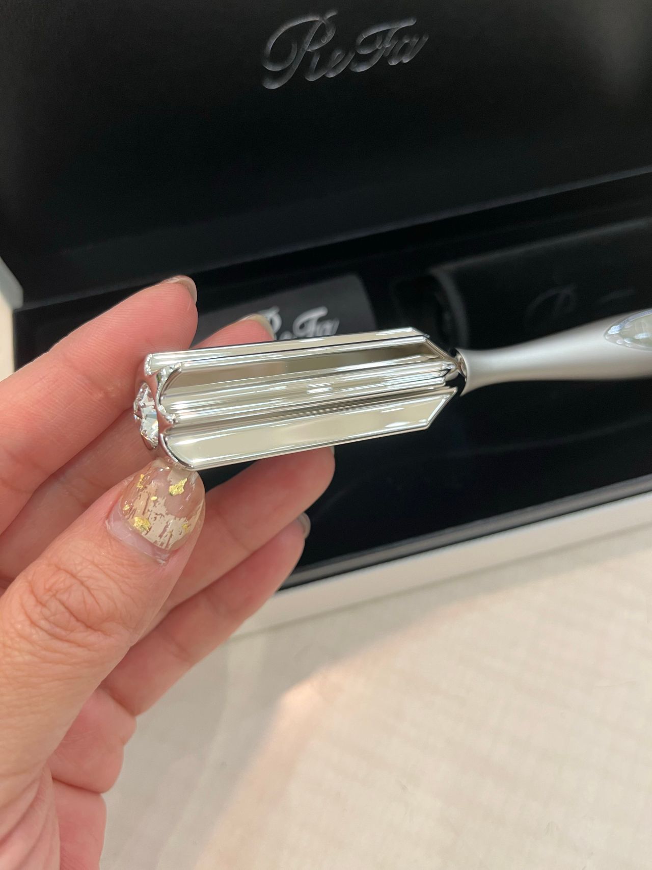 デリケートな肌に触れるローラーの表面には、美しい輝きを放つプラチナコートが施されています。
