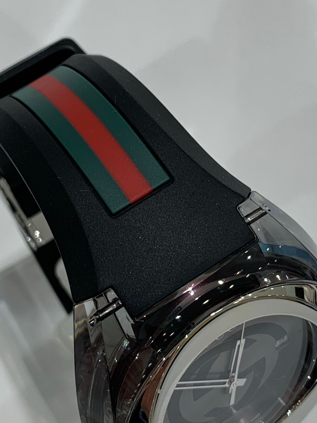 時計のケース部分はスケルトンになっていて、ステンレスベゼルのシルエットが外から確認することができ、側面にはGUCCIの刻印も入っています。