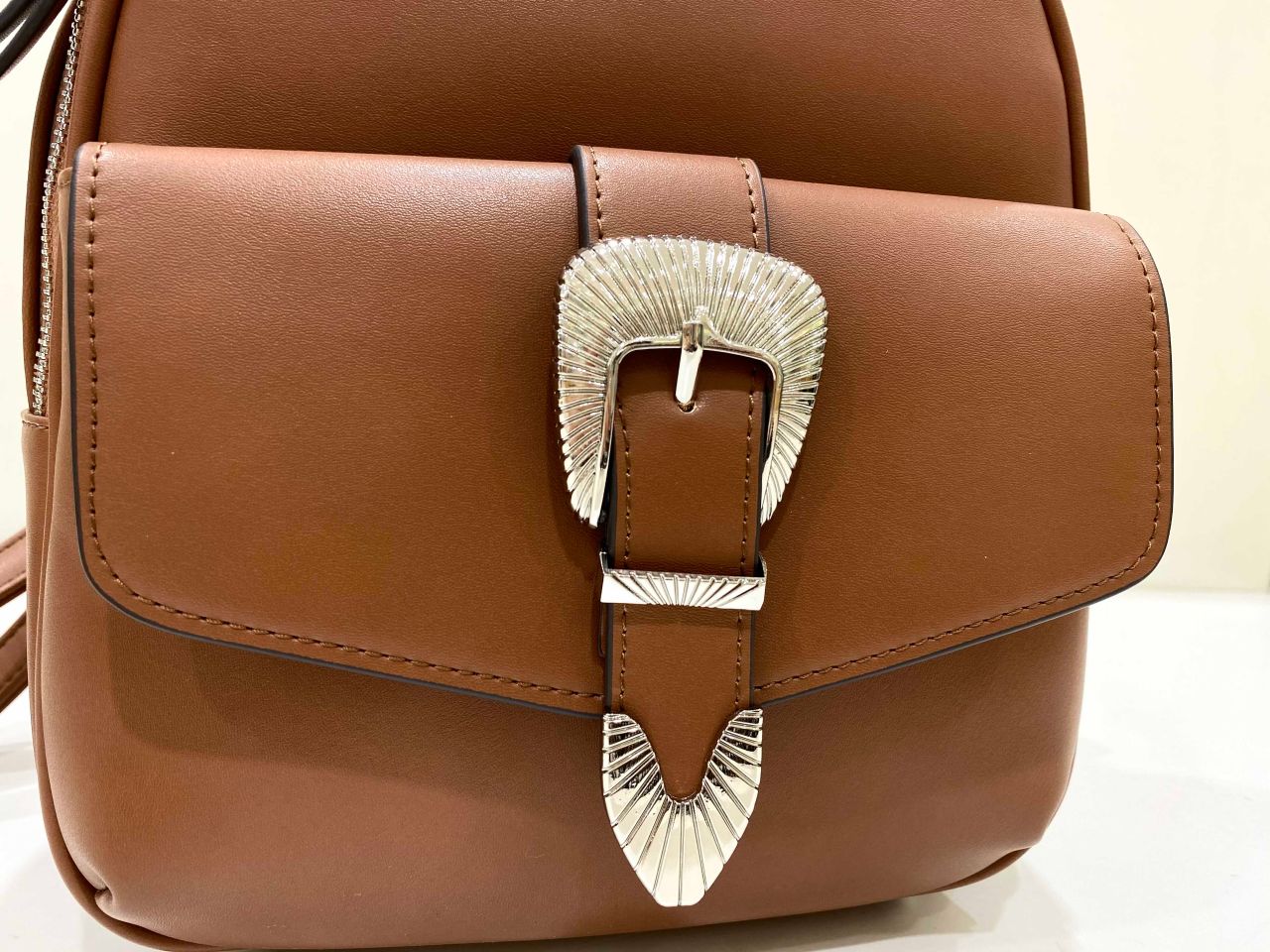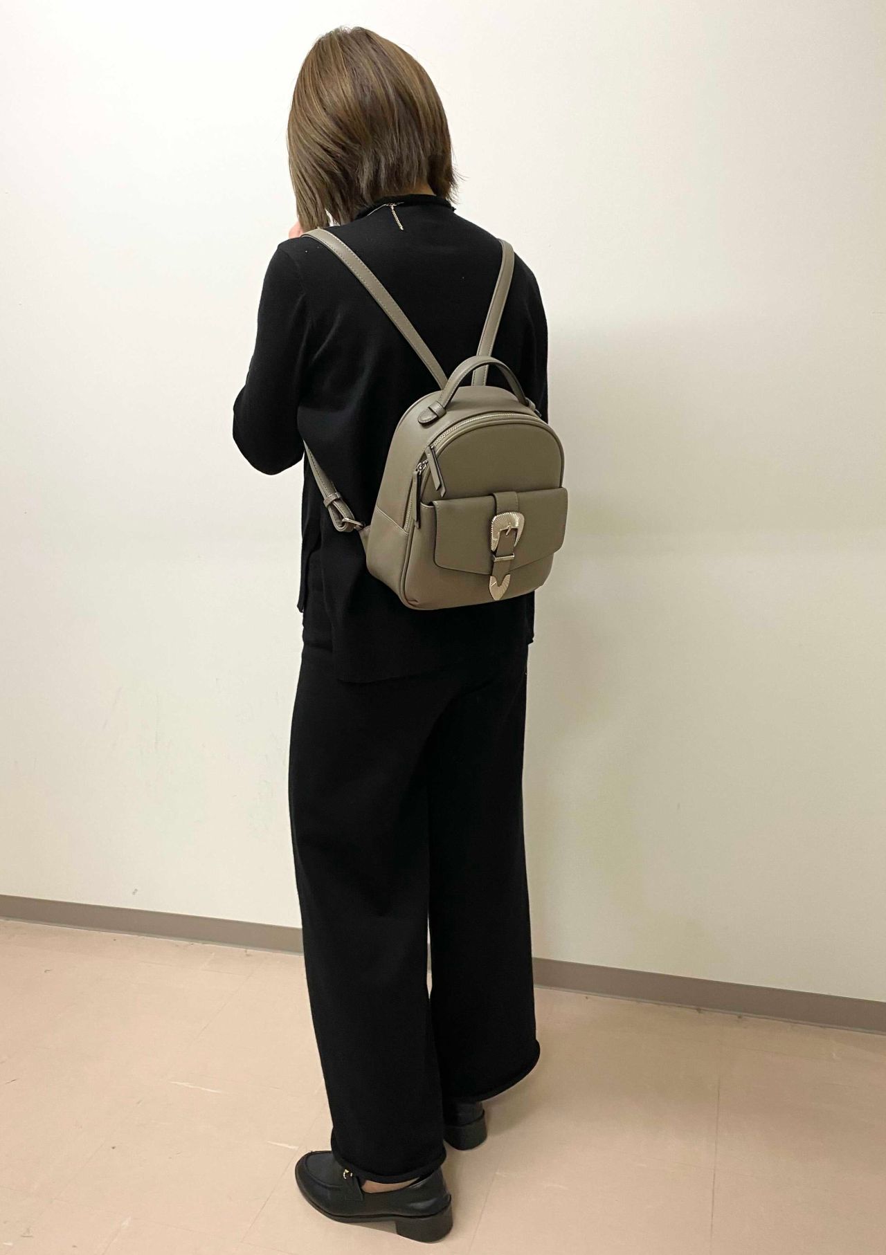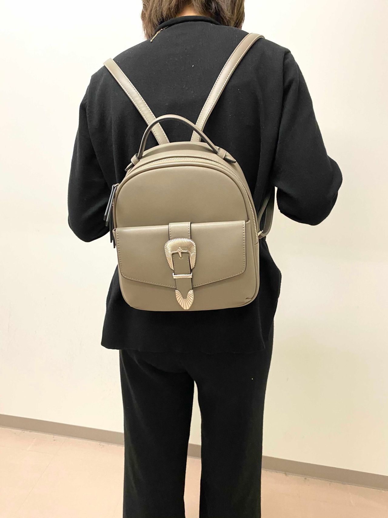 バックルがポイントになっているこちらのリュック。小さいながらマチがあるのでたくさん荷物が入ります!