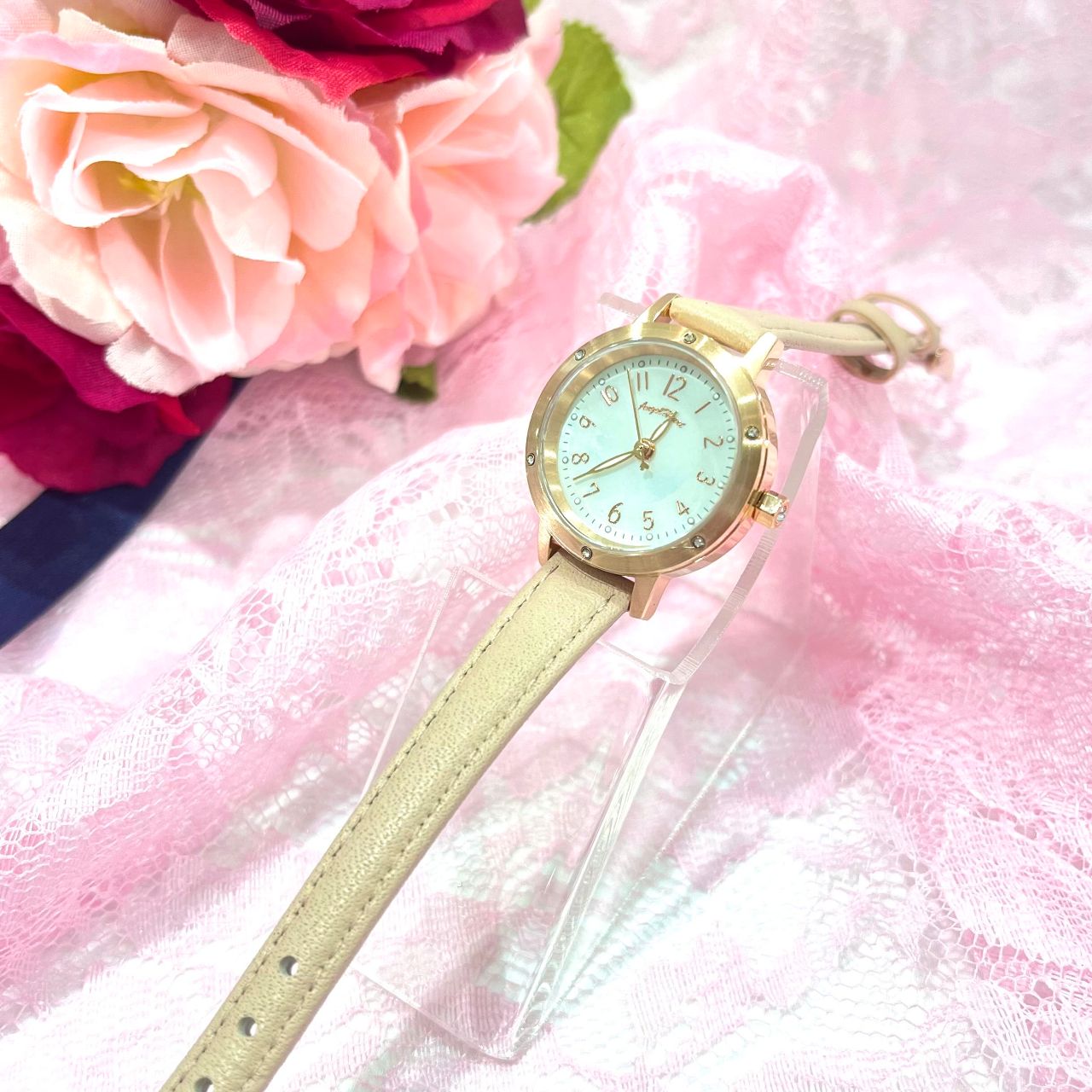 ピンクベージュの革ベルトが