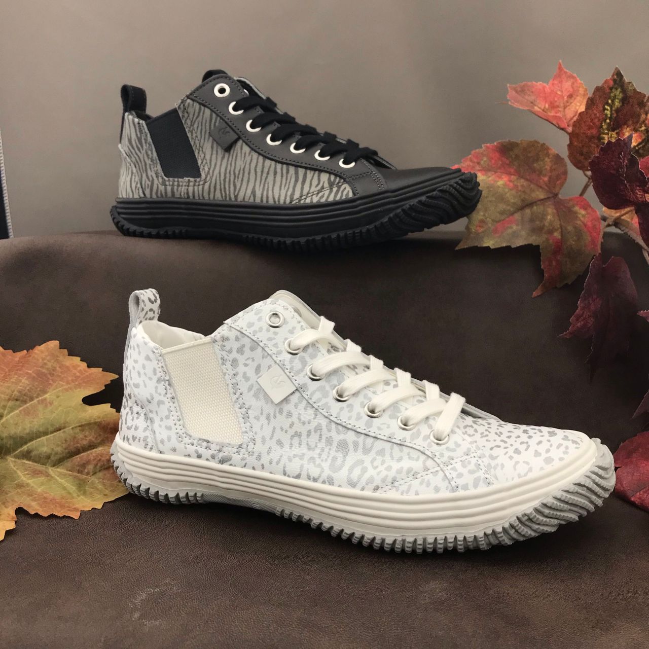 ホワイトはゴートレザー(山羊革)にスノーパンサー柄