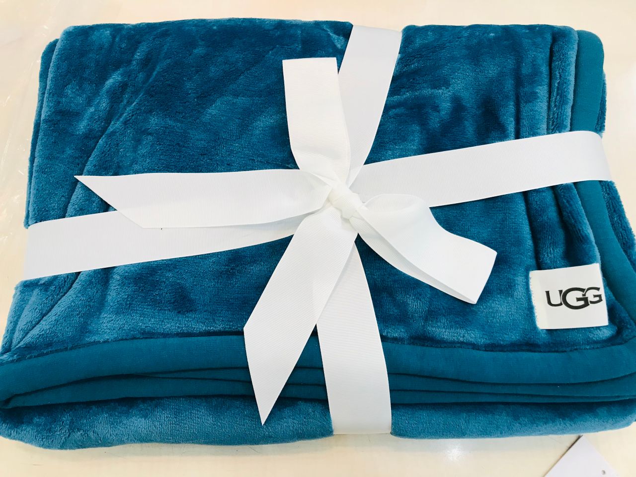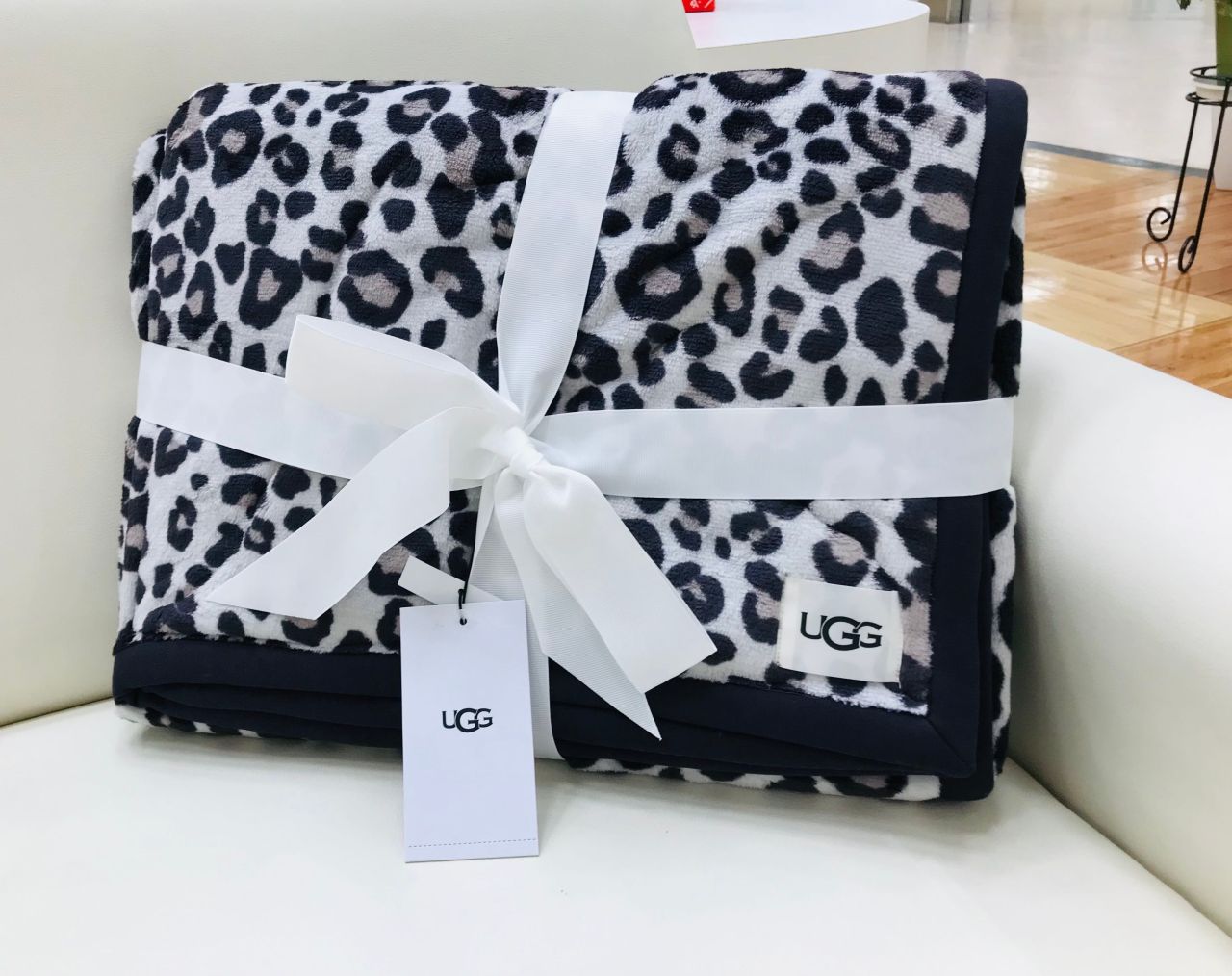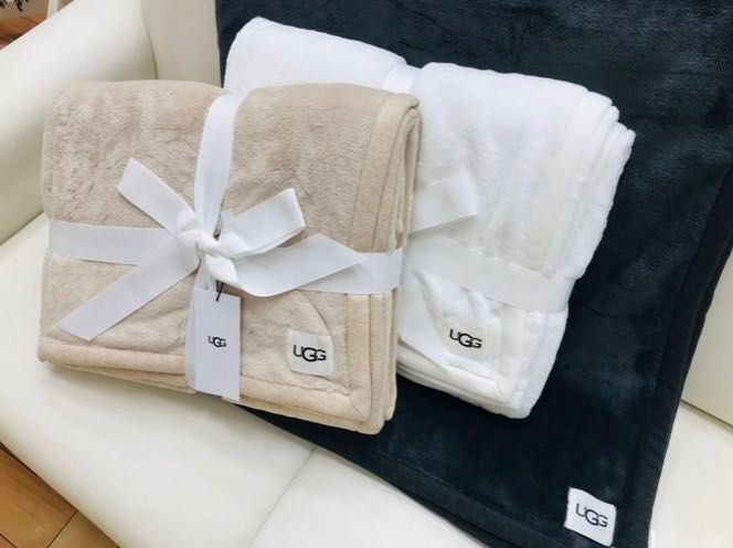 UGGのロゴが入ったこのふわふわブランケットは、こんなかわいいレオパード柄や綺麗なブルーグリーンもございます♡