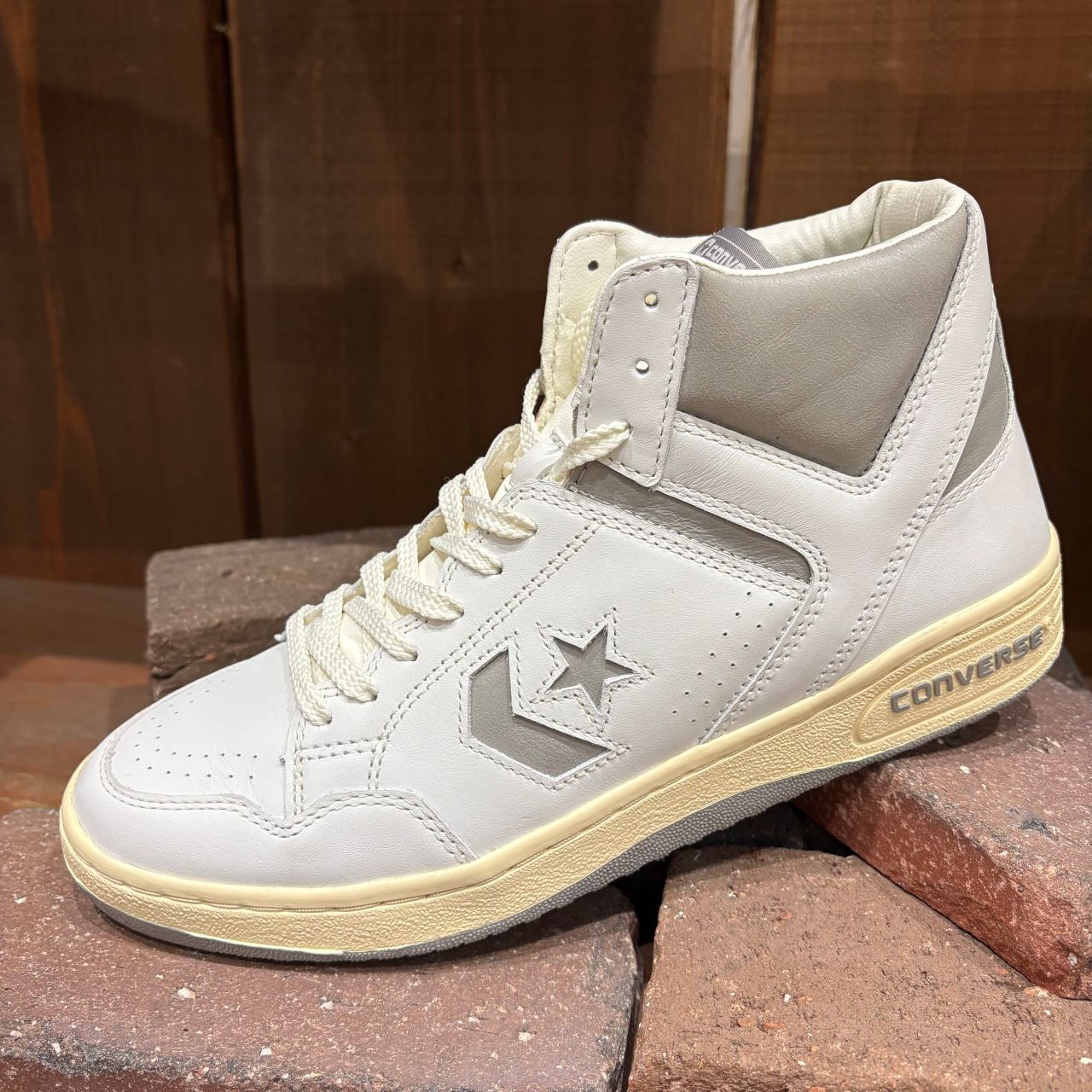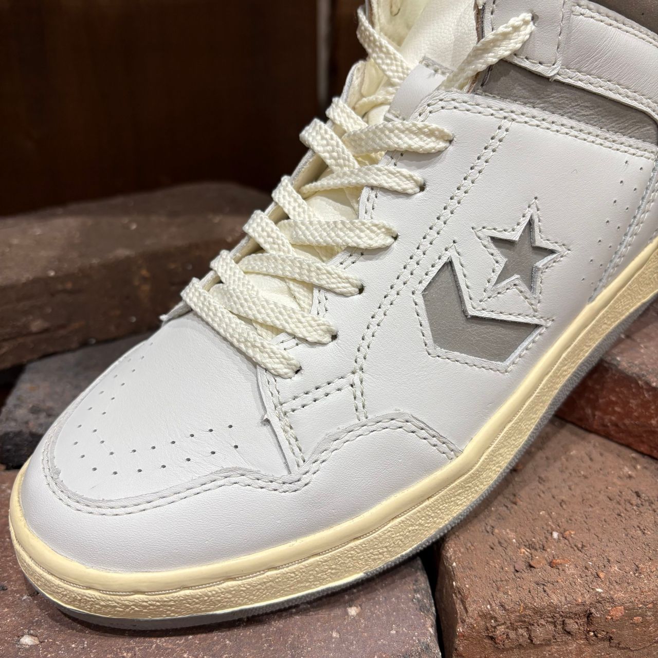 クリーム色のシューレース・ステッチ・アウトソールからは日焼けしたデッドストック感、クラッキングレザーを使った履き口やマーク部分からはビンテージ感漂うデザインに仕上げています