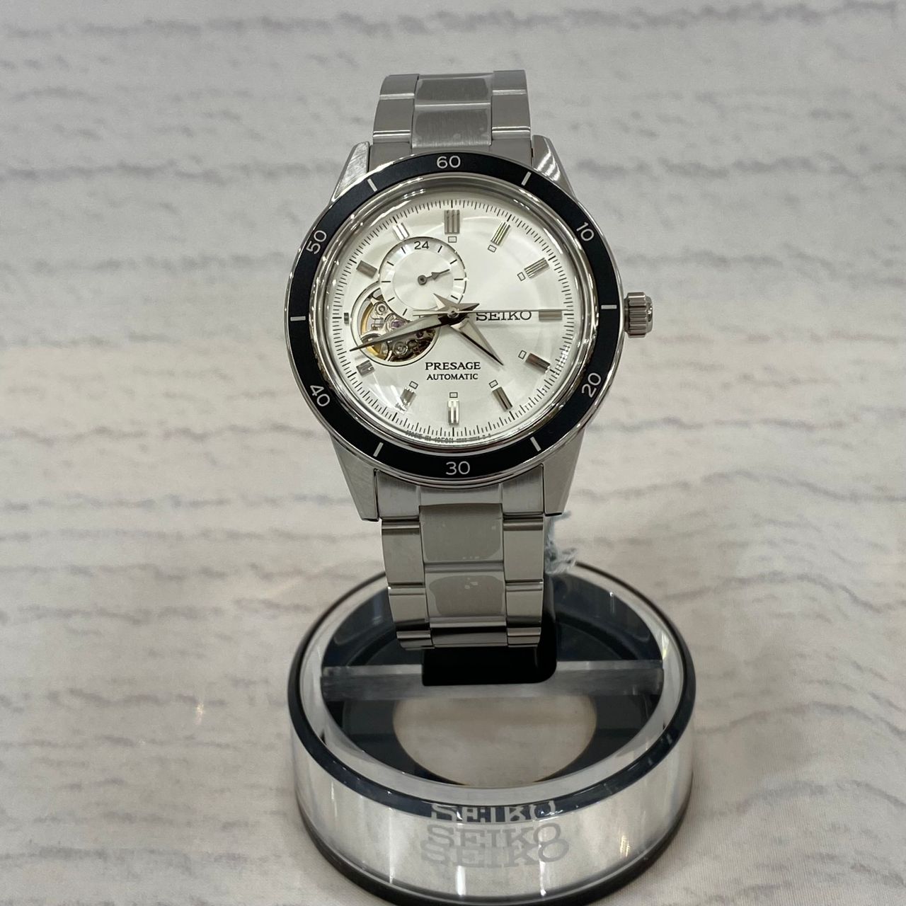 プレザージュは機械式で文字盤がオープンハートになっており、ムーブメントが見えるようになっています。