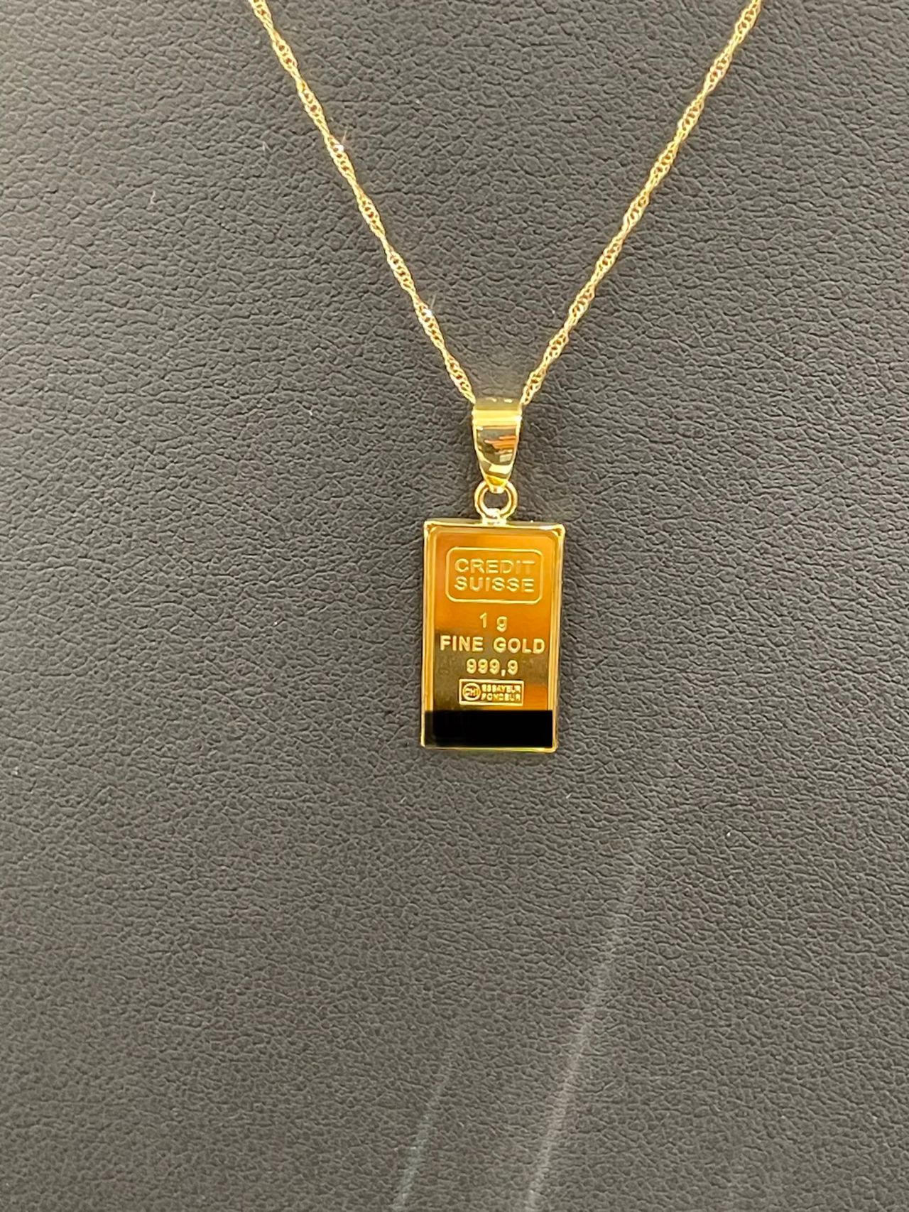 刻印された24金のインゴットがセットされたネックレスで、