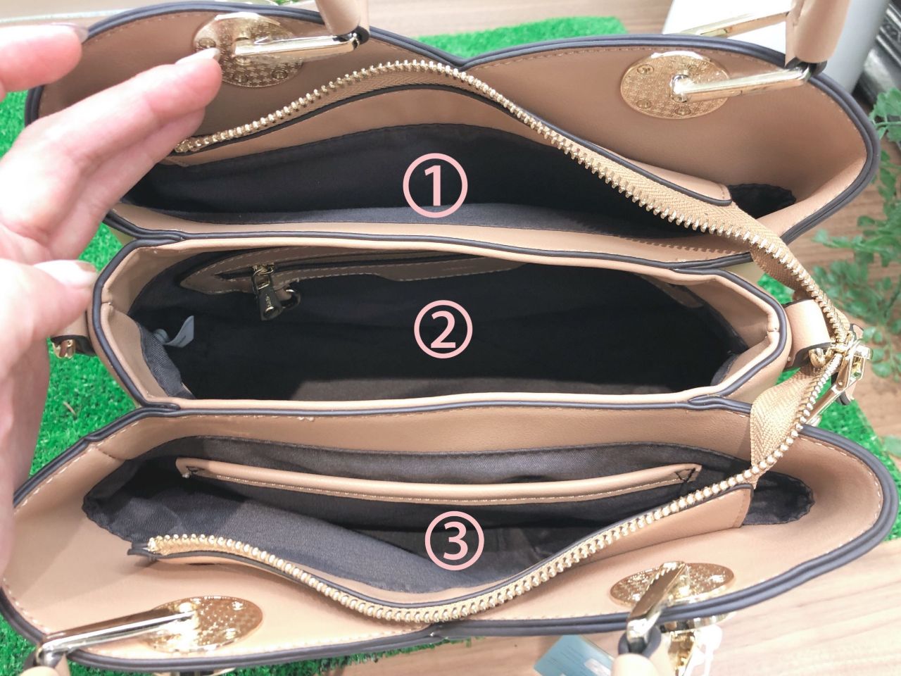 ファスナーを開けると内側はなんと3層構造になっており荷物の仕分けもきれいにできますよ!!