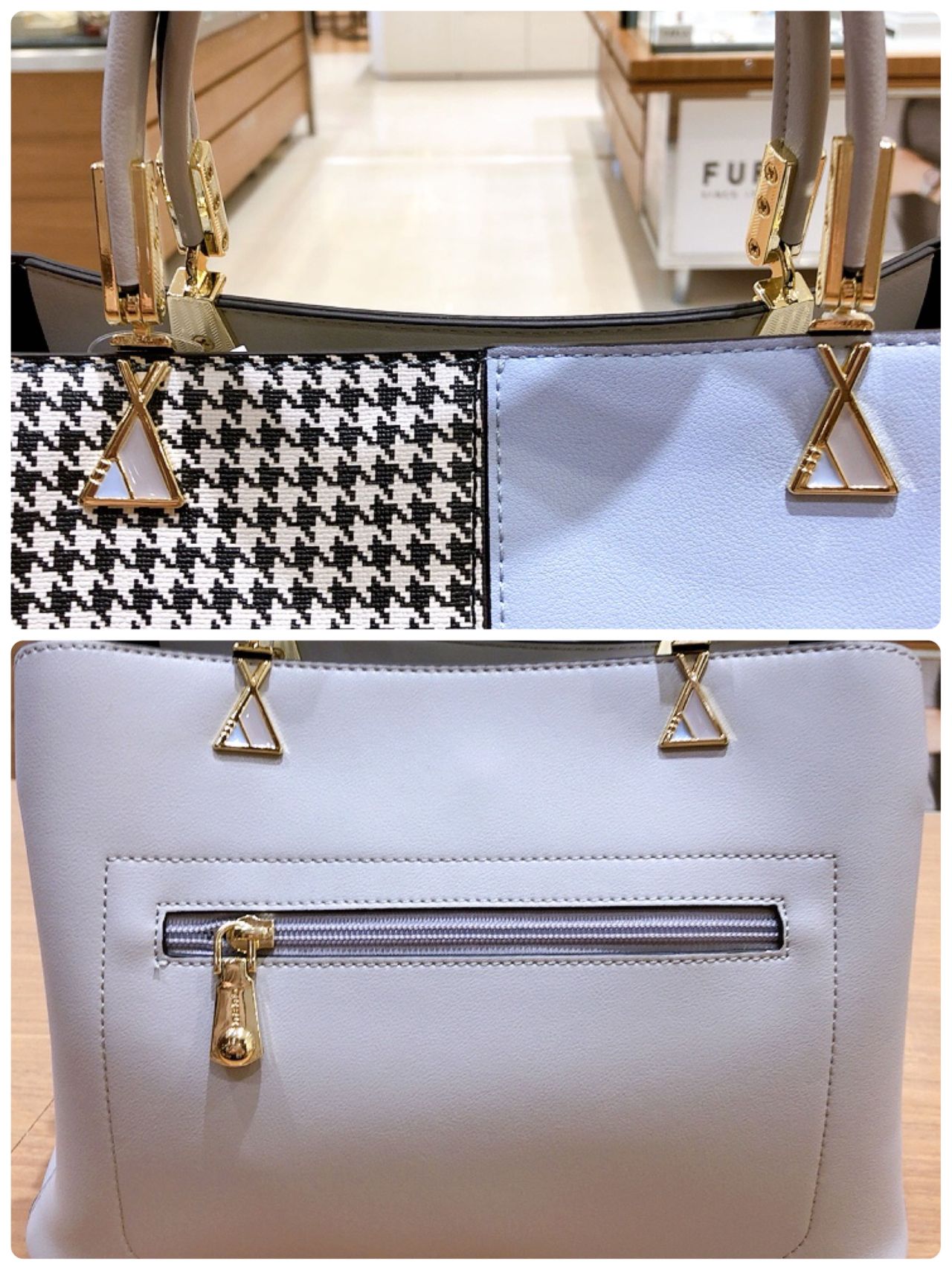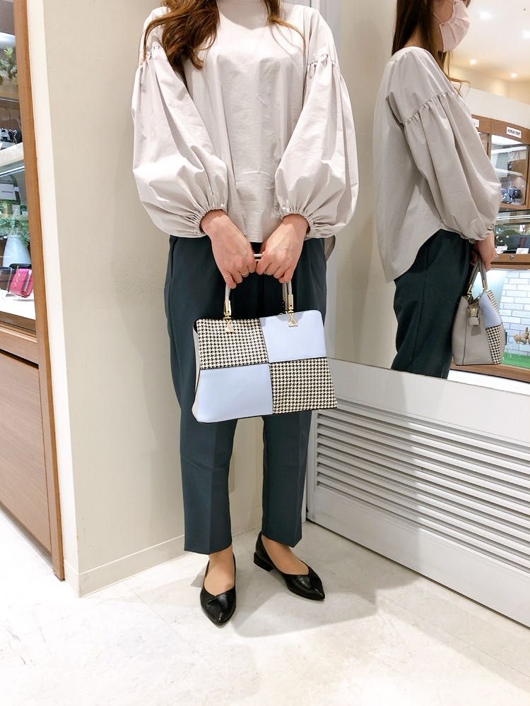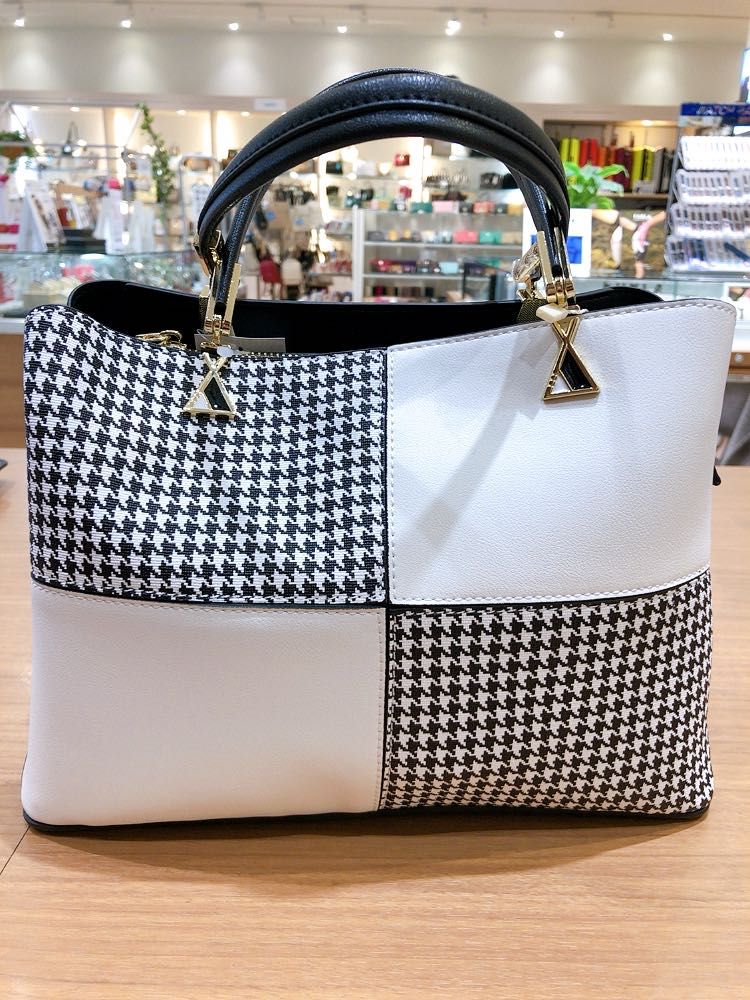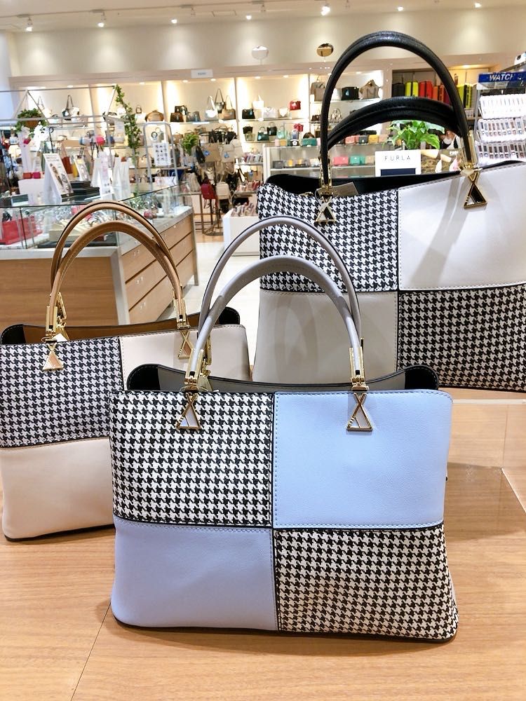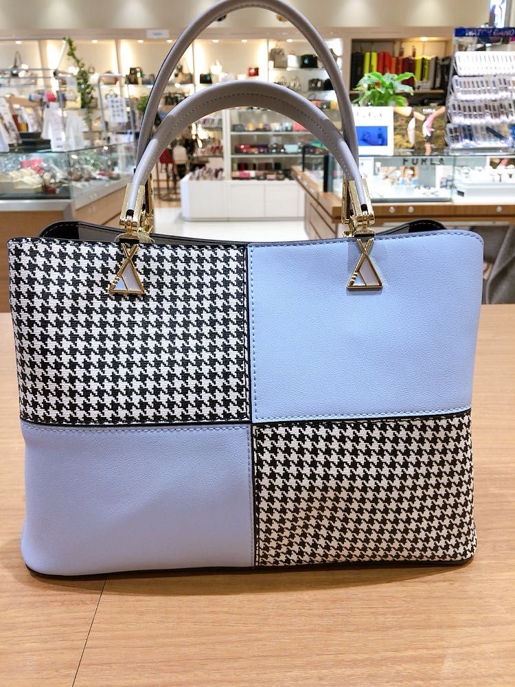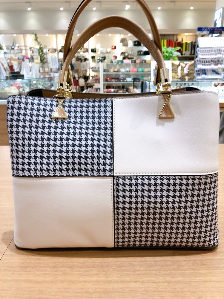 千鳥格子柄の合皮素材をカラーブロックにして配色展開したハンドバッグです♡