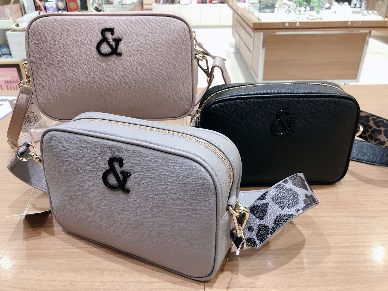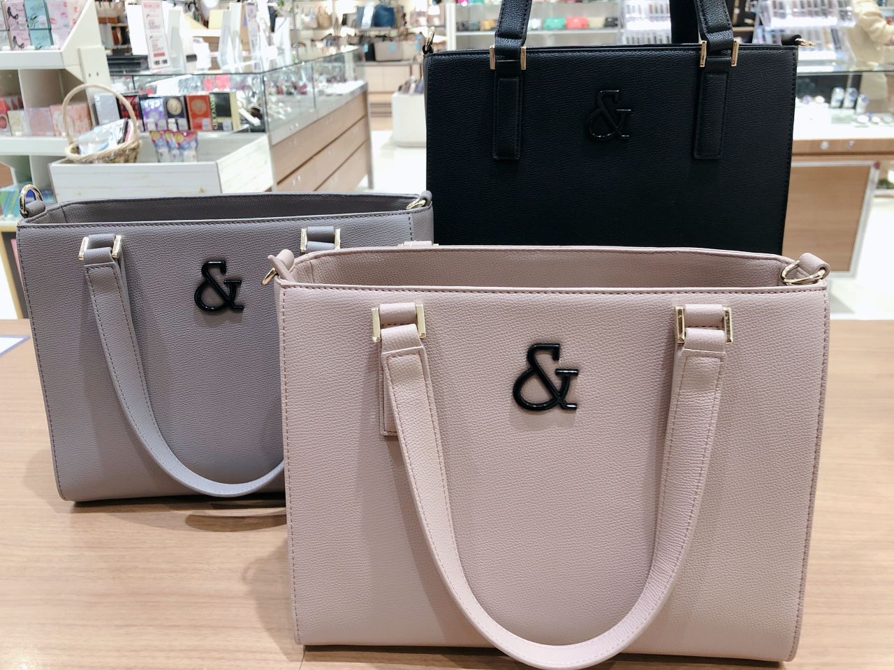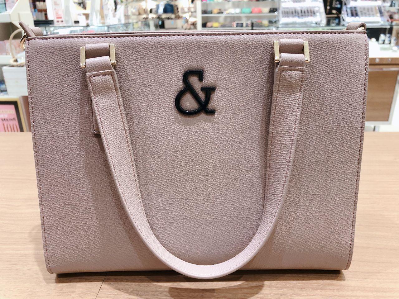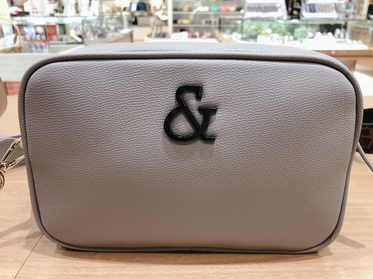 フロントに大きな&マークに流行のくすみカラーを合わせたハンドバッグです♪