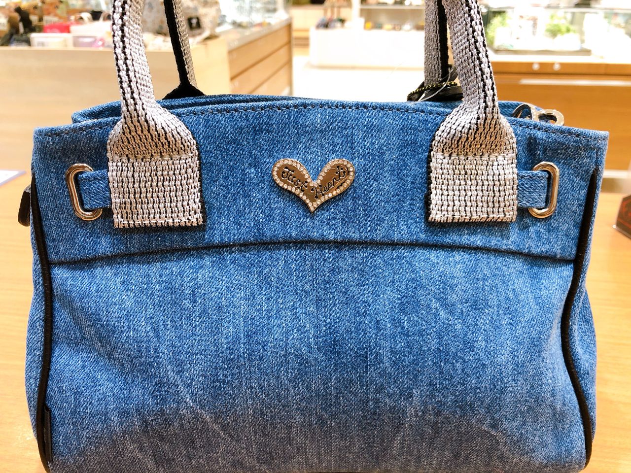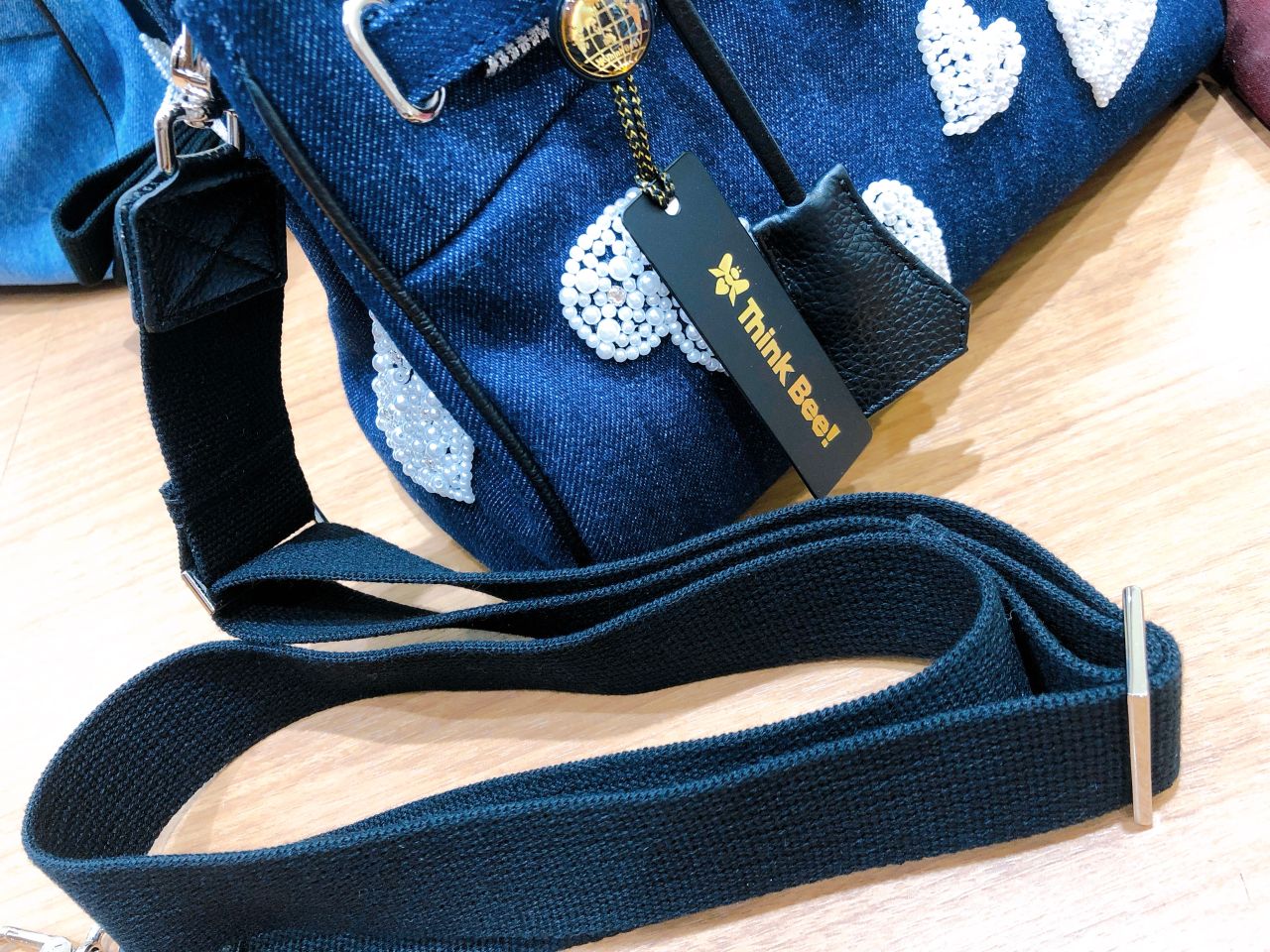 ウォッシュ加工を施したデニム地に小粒のパールをぎっしりと敷き詰めたハートのモチーフ。上品なパールの輝きが、デニムと好相性でカジュアルになりすぎず絶妙なバランスです。