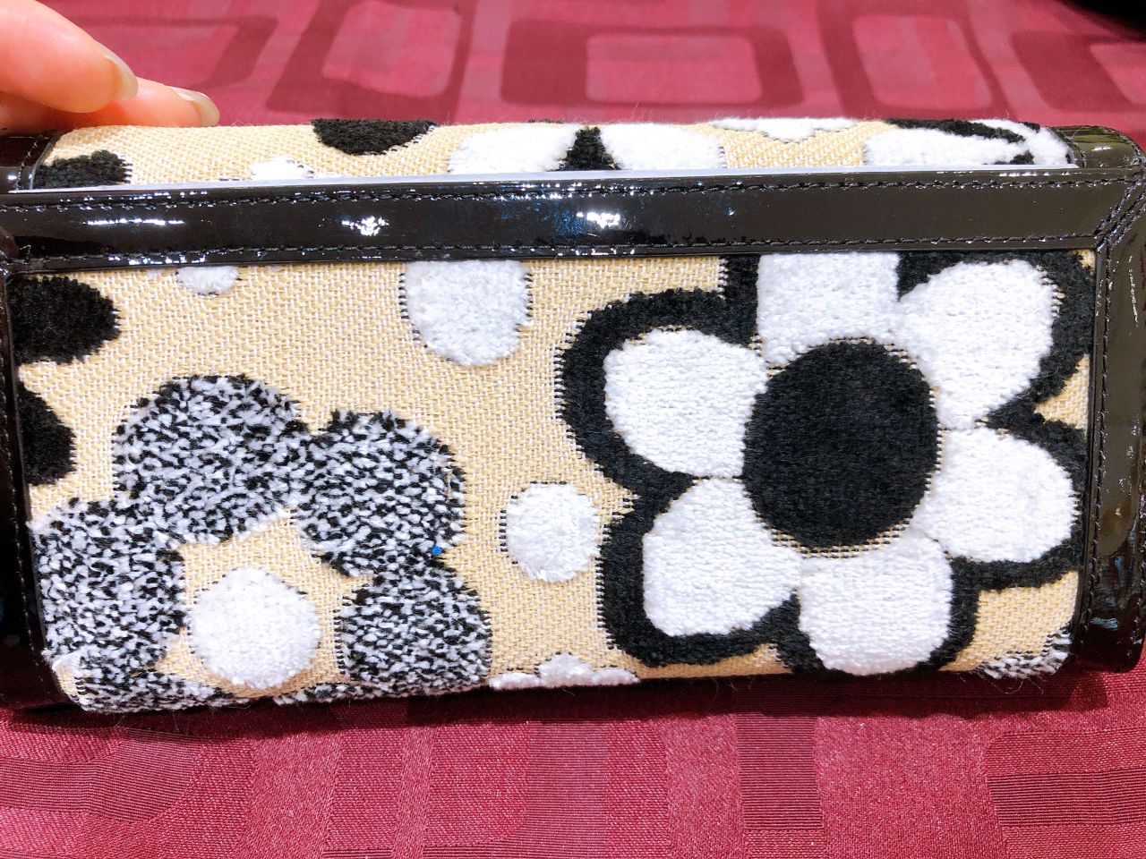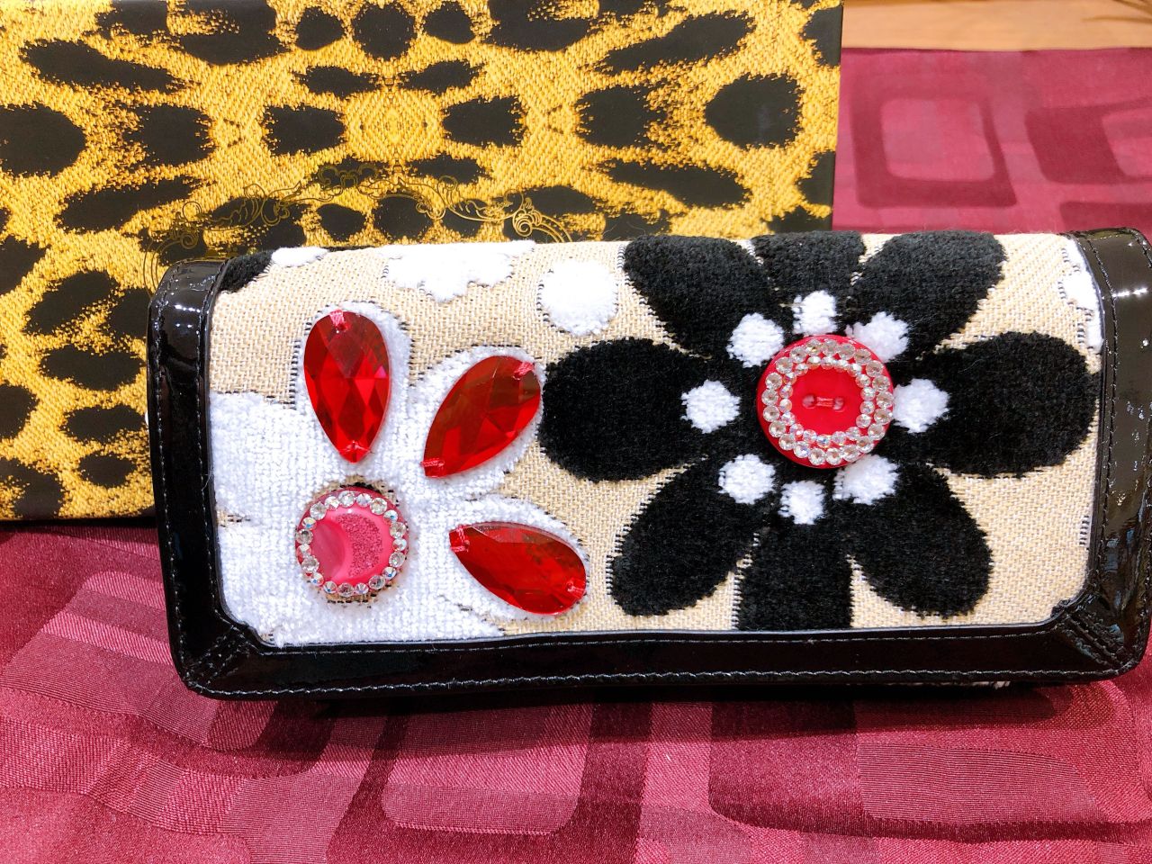 フラワー柄に、しずく型のガラスパーツやスワロフスキー・クリスタル付きのオリジナル装飾ボタンが付いていてとてもキュートで華やかなデザインの長財布です♡