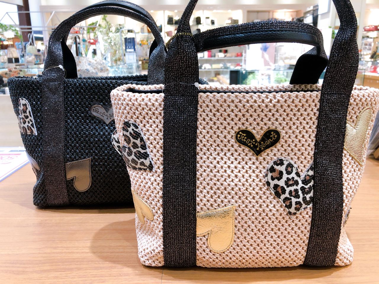 少し目が粗く、シャリ感のあるメッシュ生地に、牛革のレザーハートの組み合わせが、とてもユニーク。踊るようにアップリケしたハートは、レオパードとシャイニーなグレーのメタリックのレザーで存在感たっぷり。