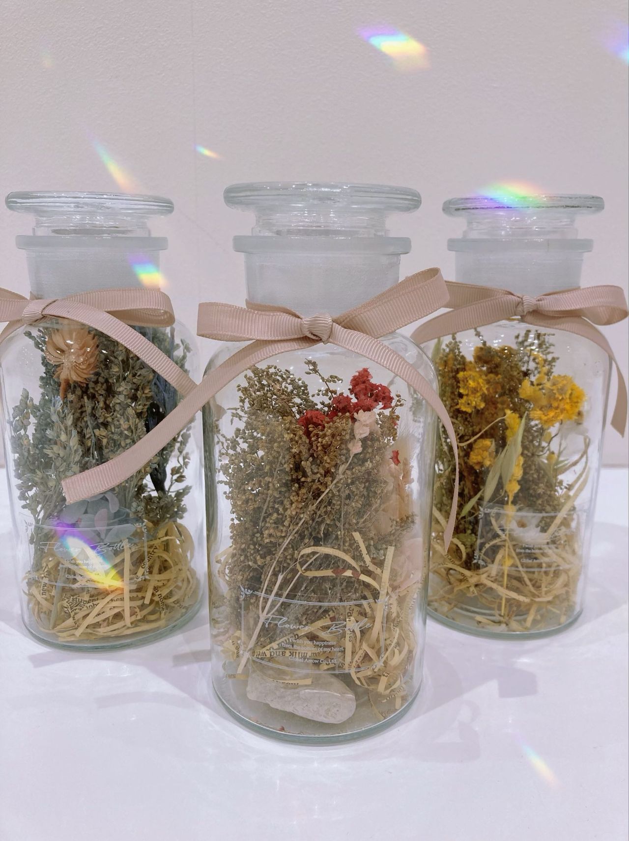 ボトルの中には、それぞれ3色のドライフラワーが入っていて、フタを開けると優しい癒される香りがします・.。*・.。*♡