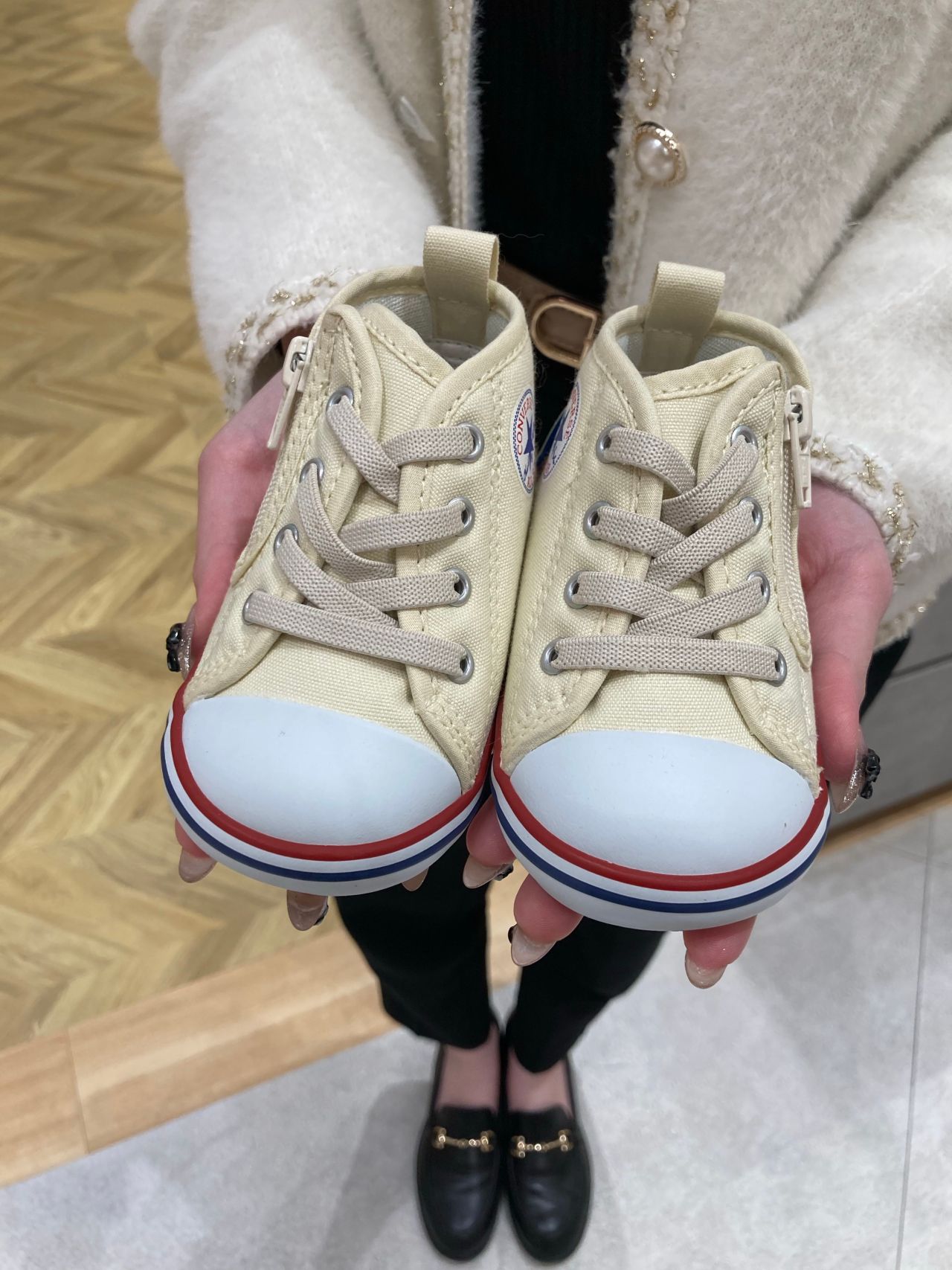 ファスナーデザインなので小さなお子様でも脱ぎ履きしやすく、ヒモの結びも手間がかからないのが嬉しいポイント・:*+.\(( °ω° ))/.:+