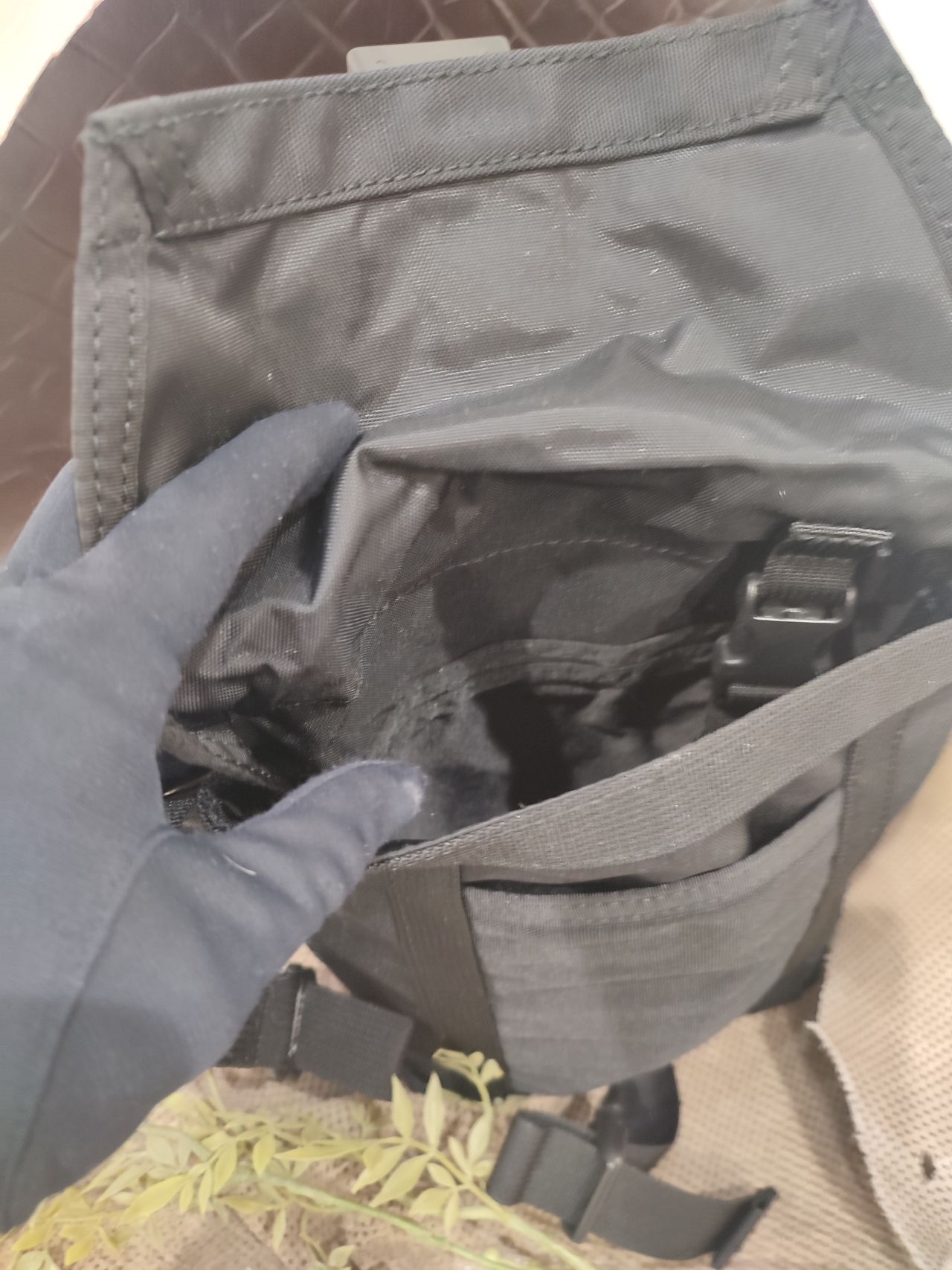 繍。フラップはバックルで開閉できます。
