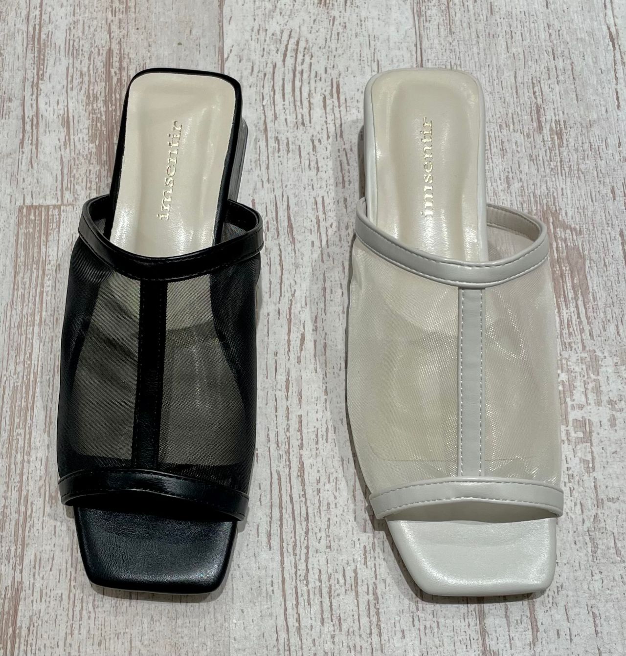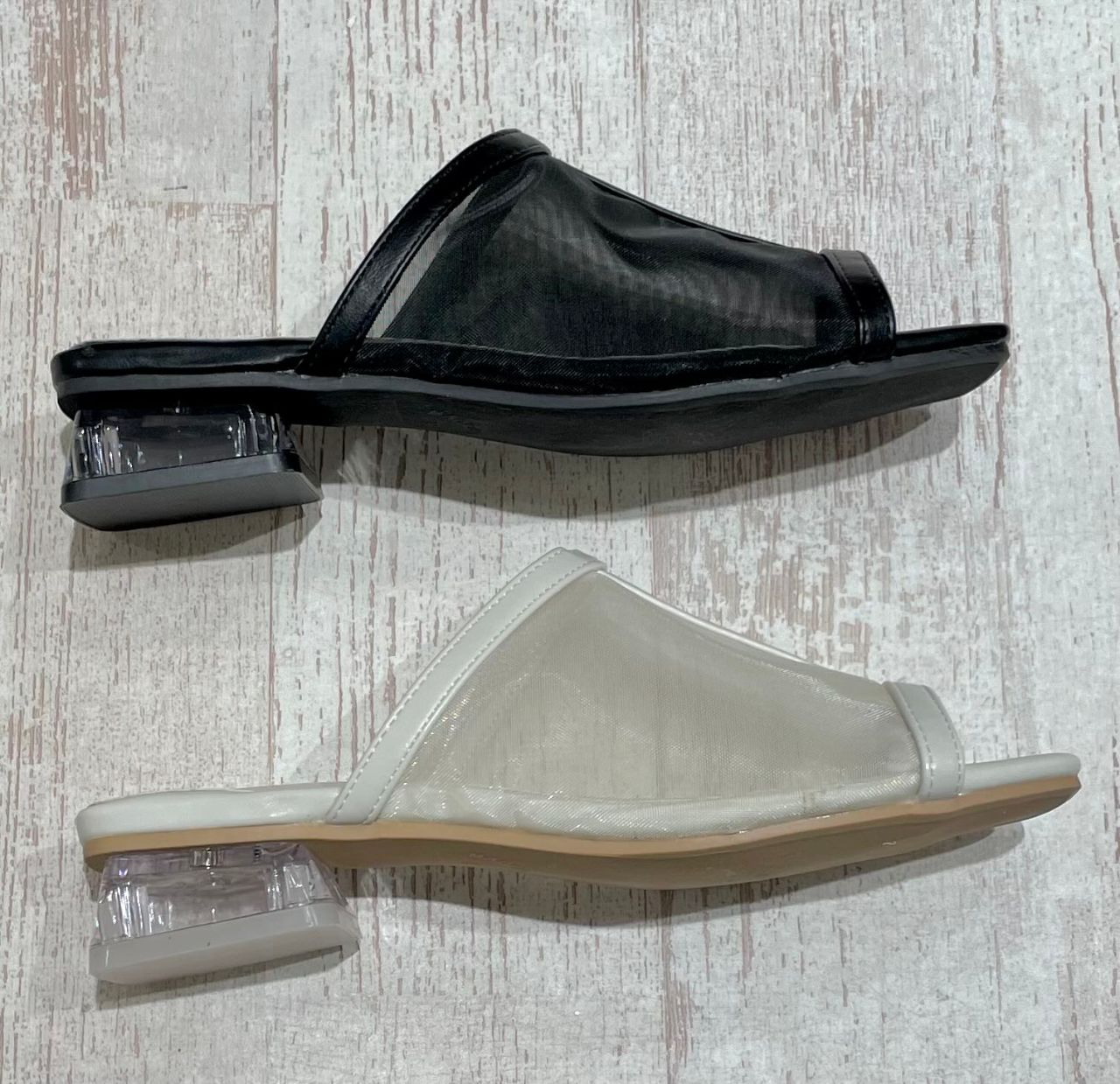 透け感のあるシアー素材とクリアヒールがヘルシーな足元を演出してくれるミュール☆*。シアー素材をピリッと引き締めるセンターパイピングで、大人な雰囲気を楽しめるデザインに☺︎素足でもソックスで遊びを加えても楽しいアイテムです!!¨̮♡