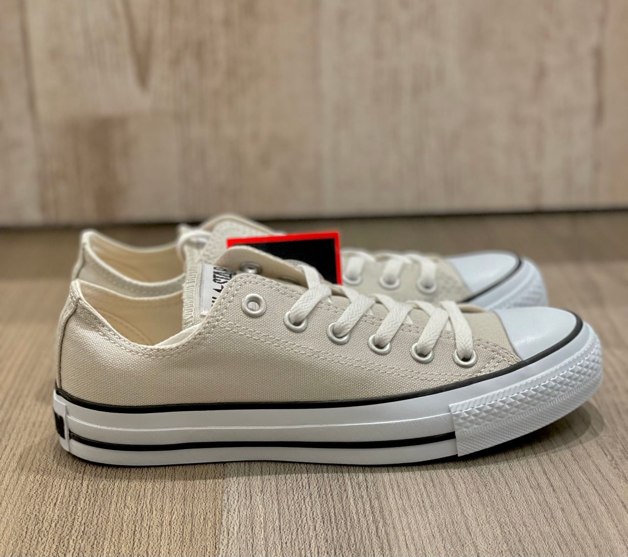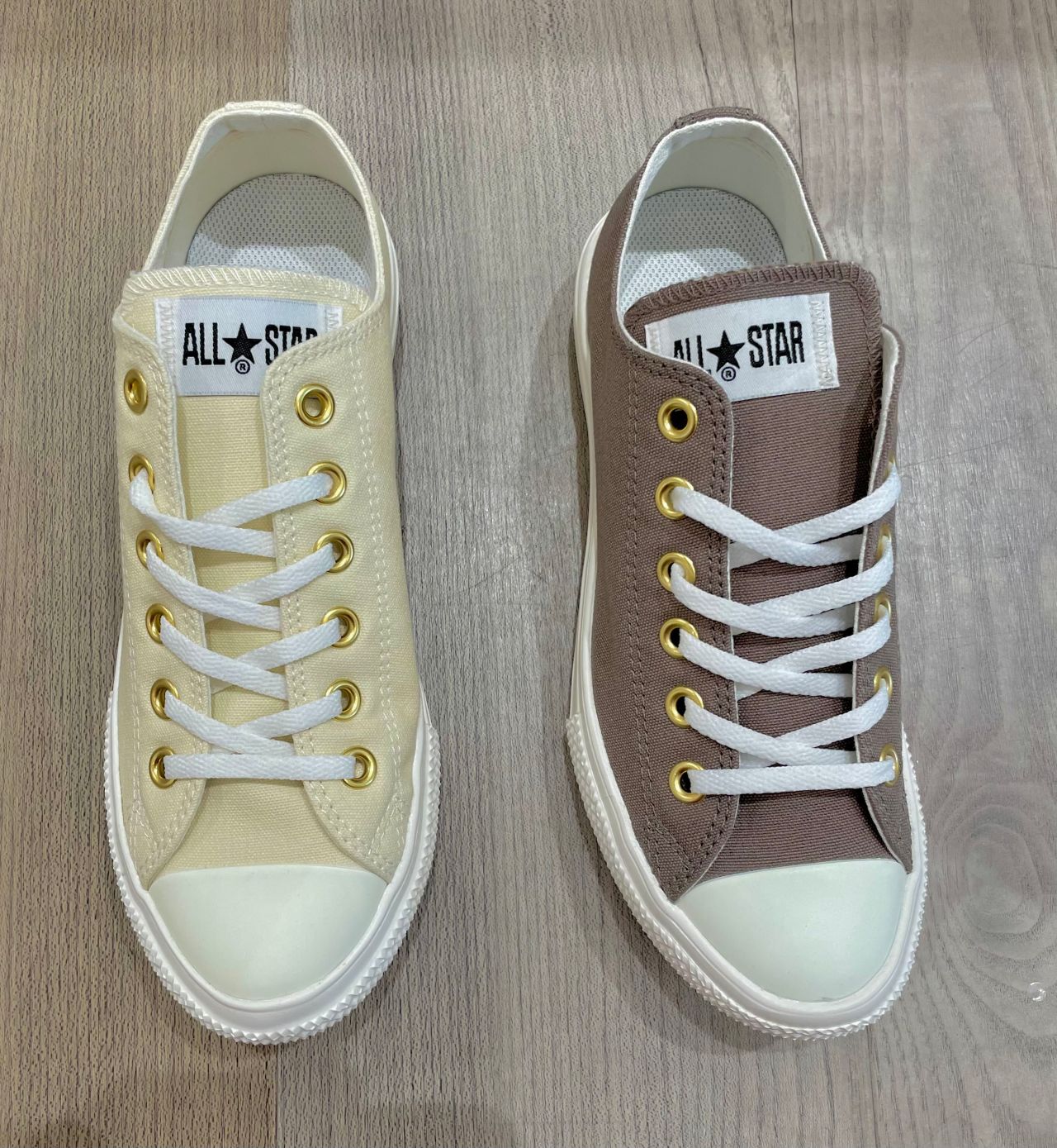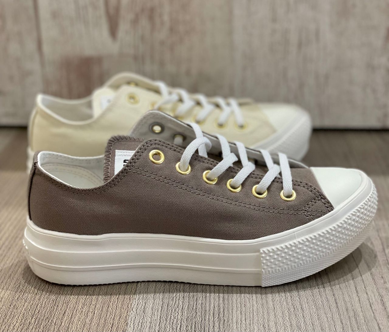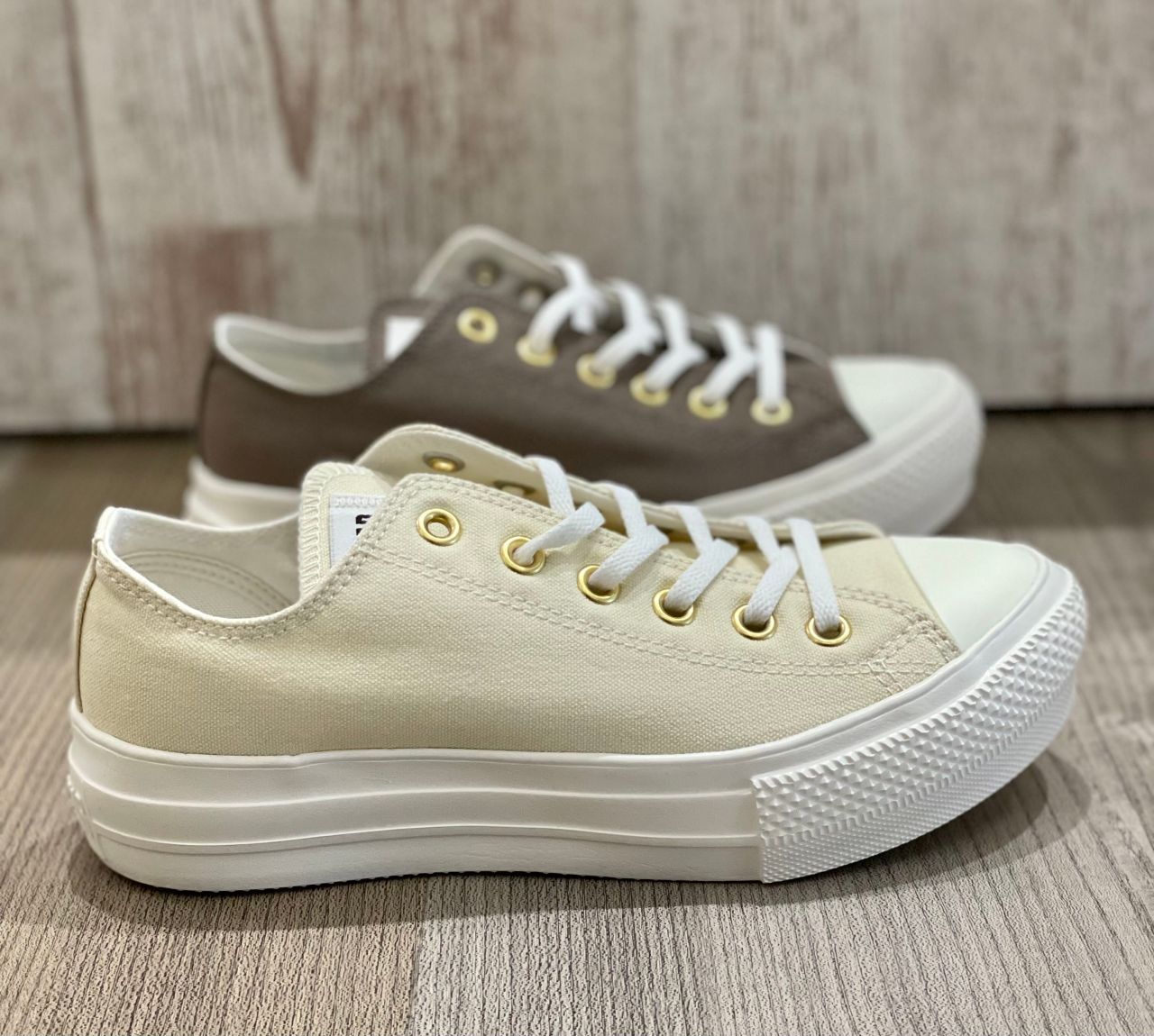 オールスターライトのパターンアレンジモデルです!!E.V.A.のアウトソールを搭載した軽量オールスターになります☺︎☺︎通常モデルより10ミリ高い厚底ソール設計でスタイルアップ効果もできるアイテム!!トープとクリームのニュアンスカラーにゴールドハトメでエレガントさをプラスしたデザインです¨̮♡