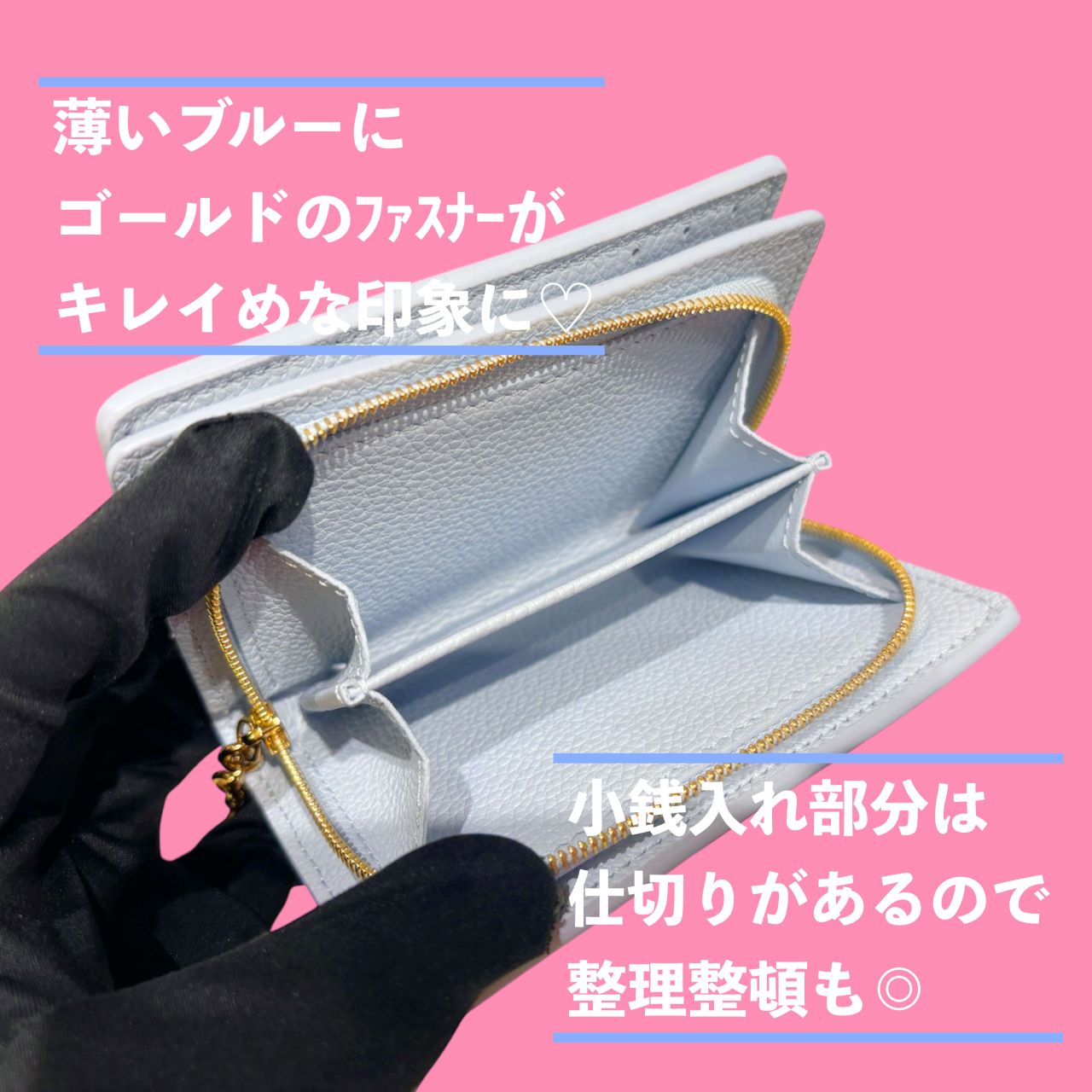 薄めのブルー に ゴールドの金具 が