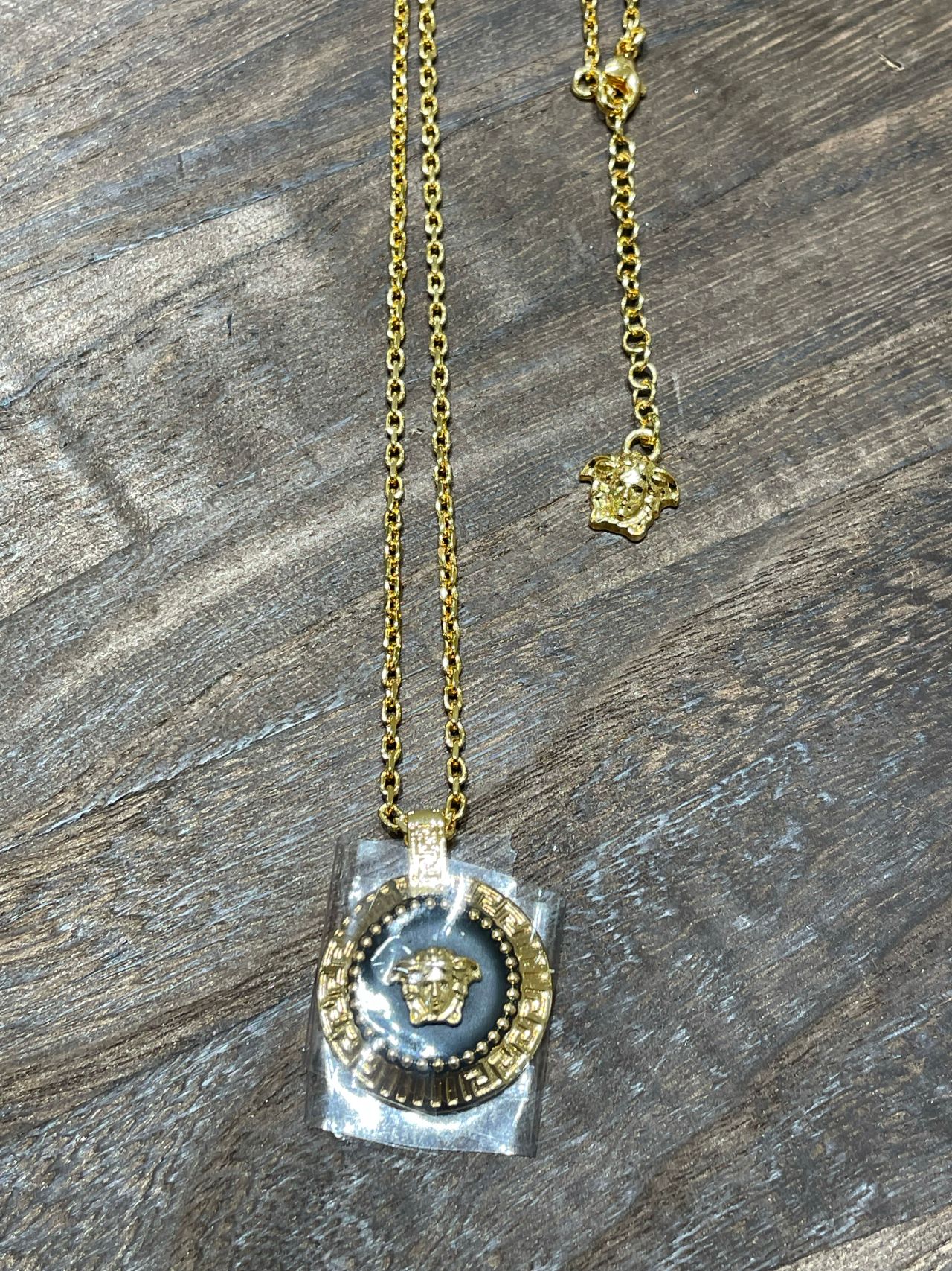 グレカボーダーで中央のメデューサを取り囲んだ円形のエナメルペンダント付き、ゴールドトーンネックレス。
