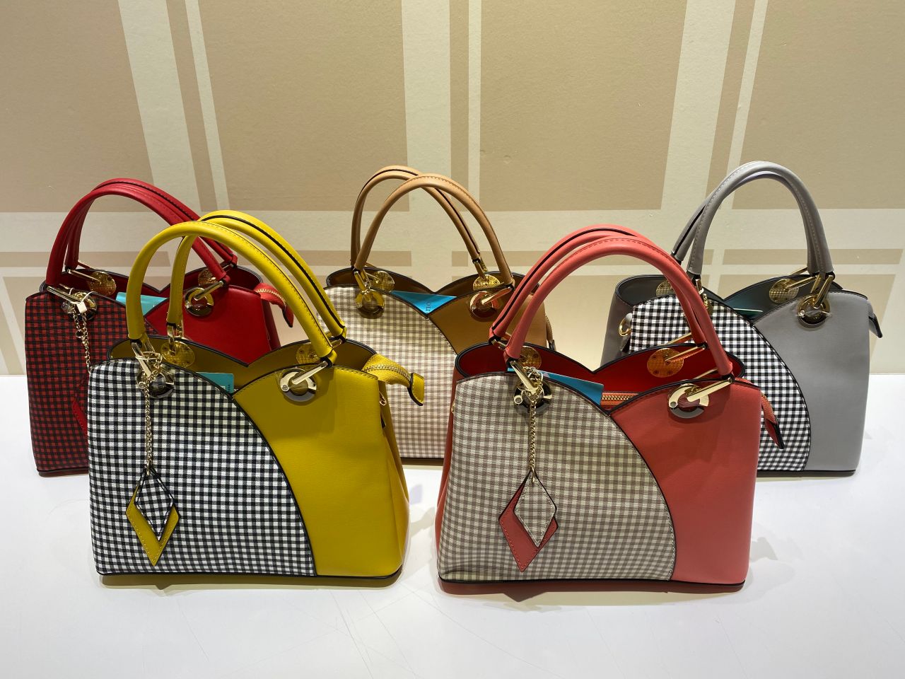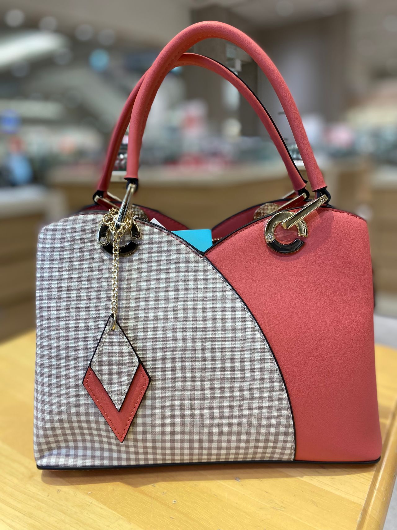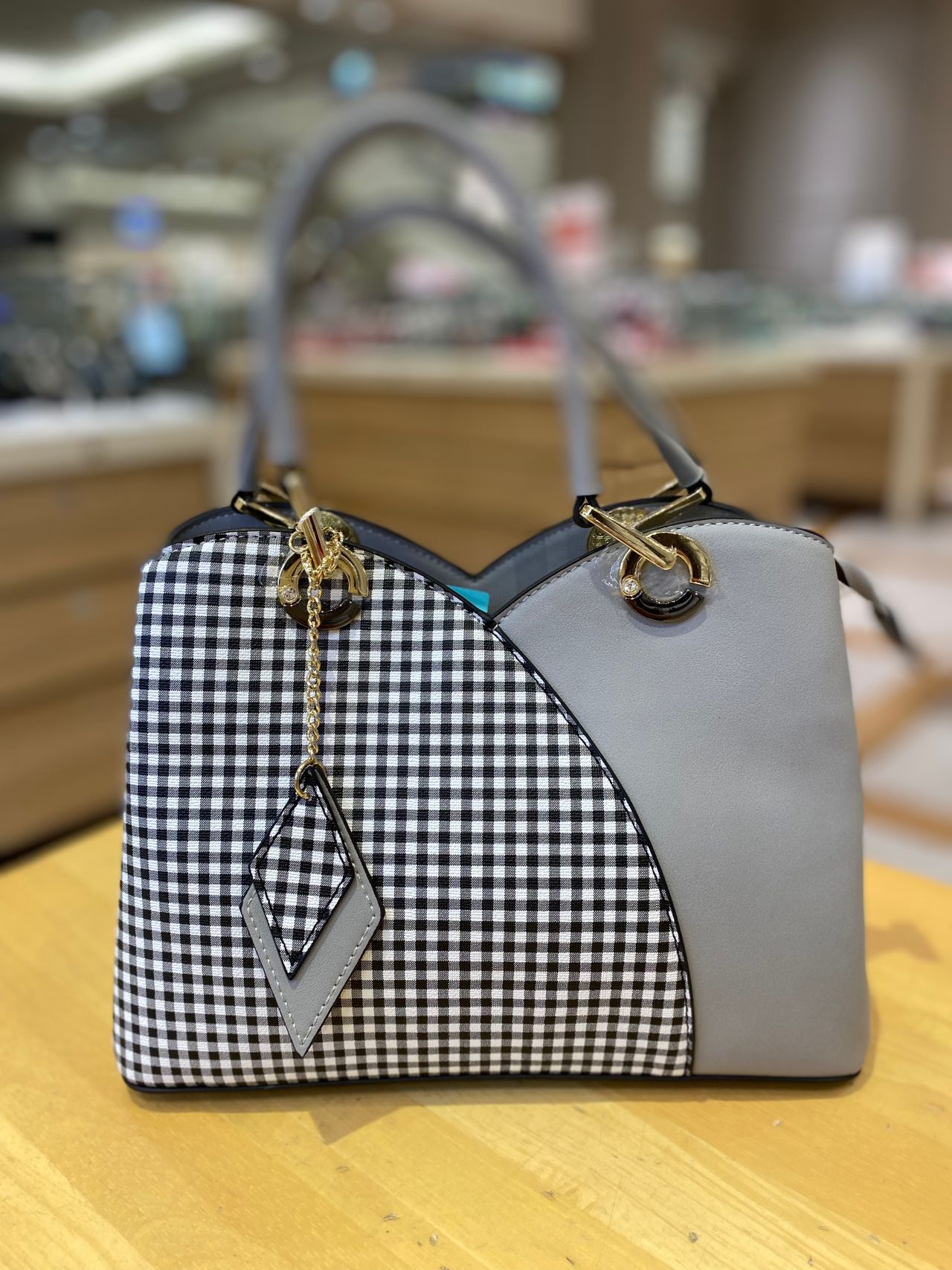 上部を山型のデザインでセンターを切り返し、片側にチェック柄をプリントしたバッグ☆