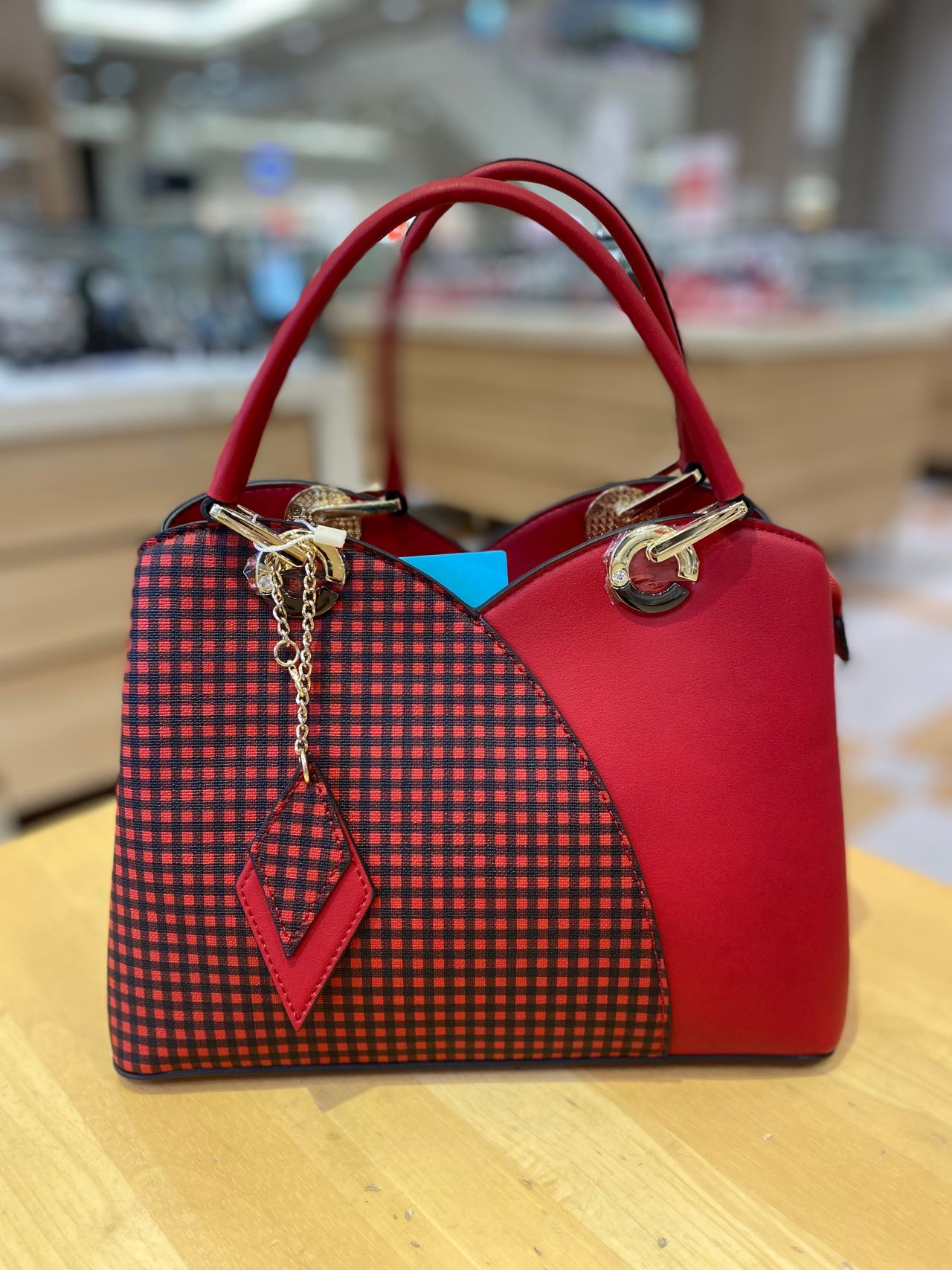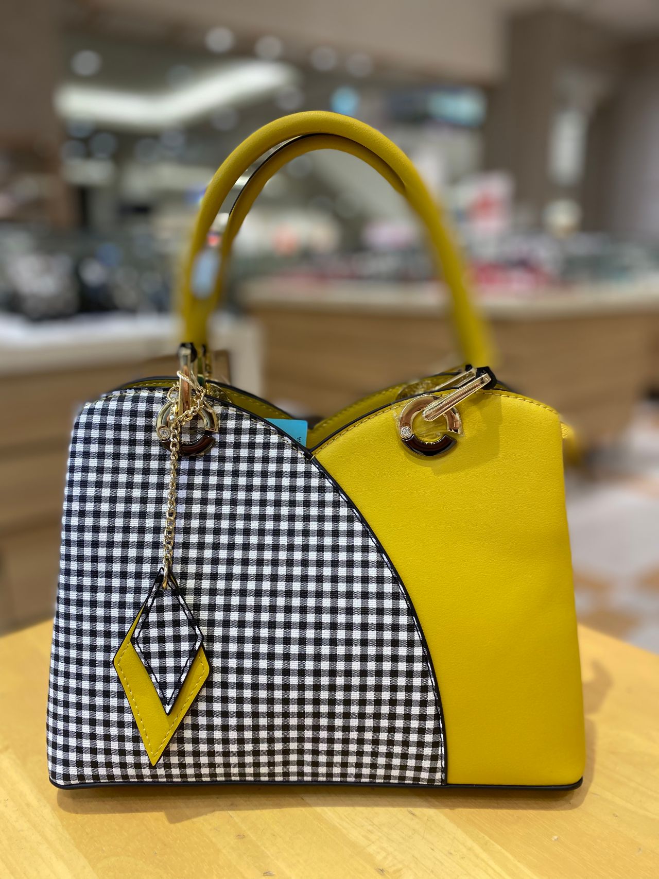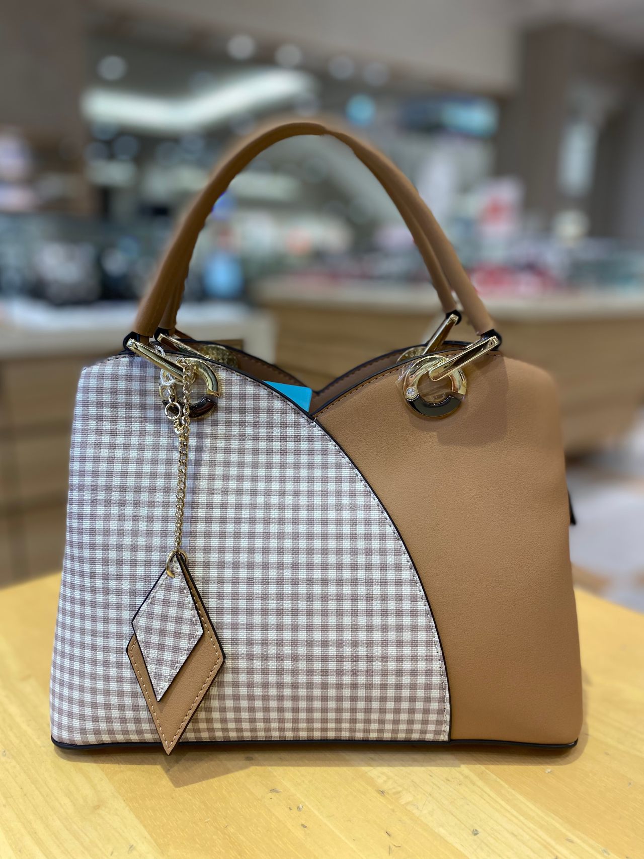 上部を山型のデザインでセンターを切り返し、片側にチェック柄をプリントしたバッグ☆