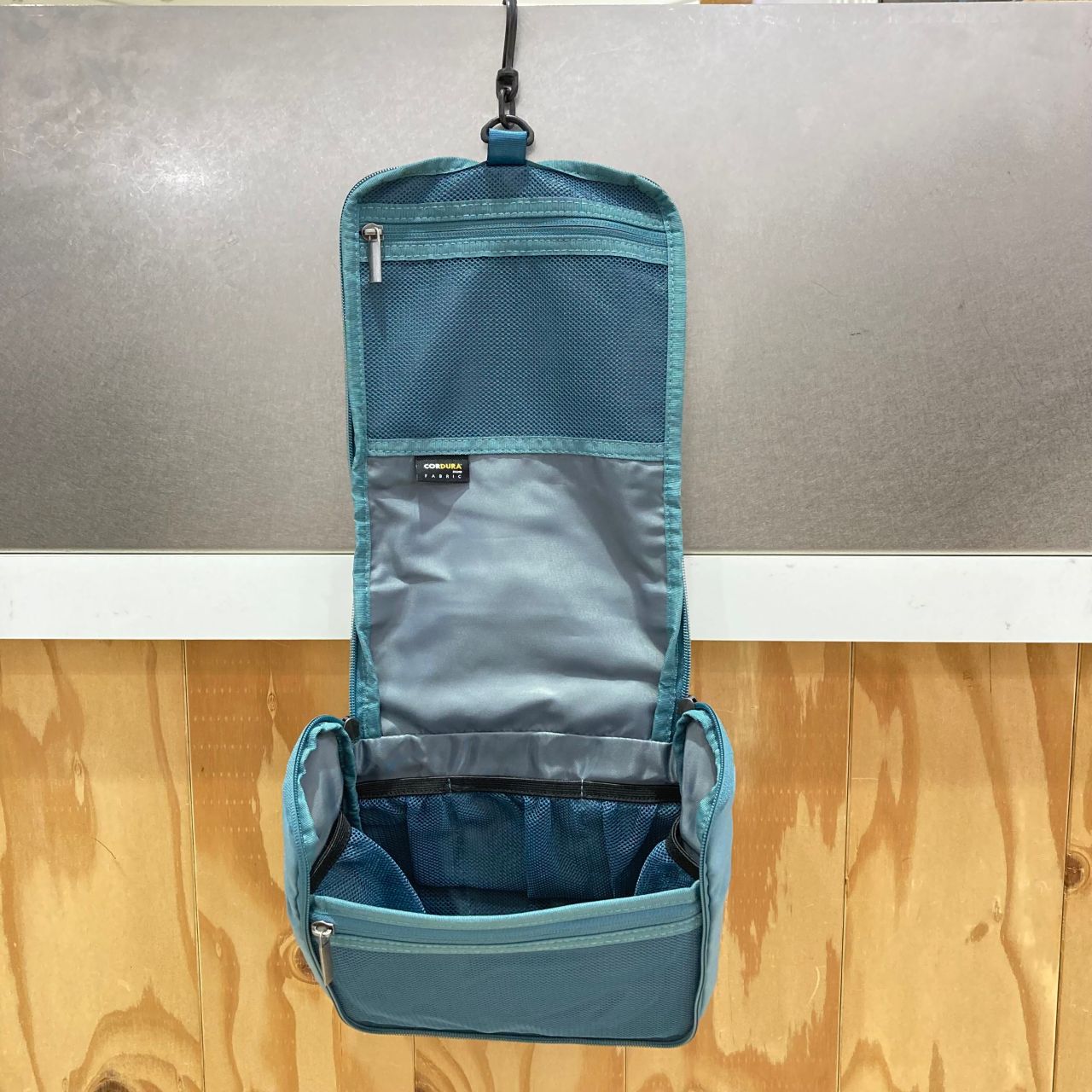 ファスナーを開いて付属のフックを出せば、取っ手や壁に吊るして使うことが出来ます。