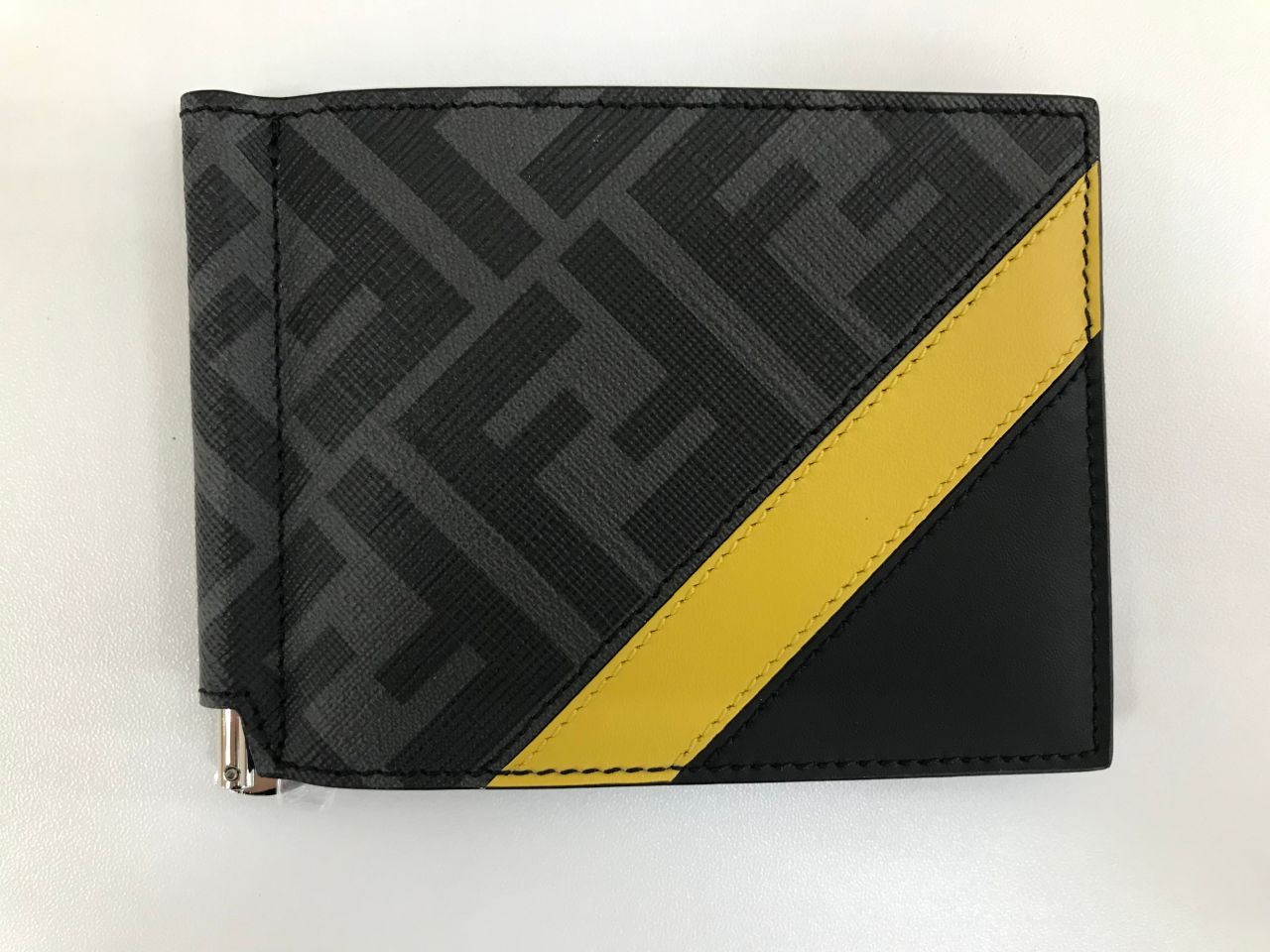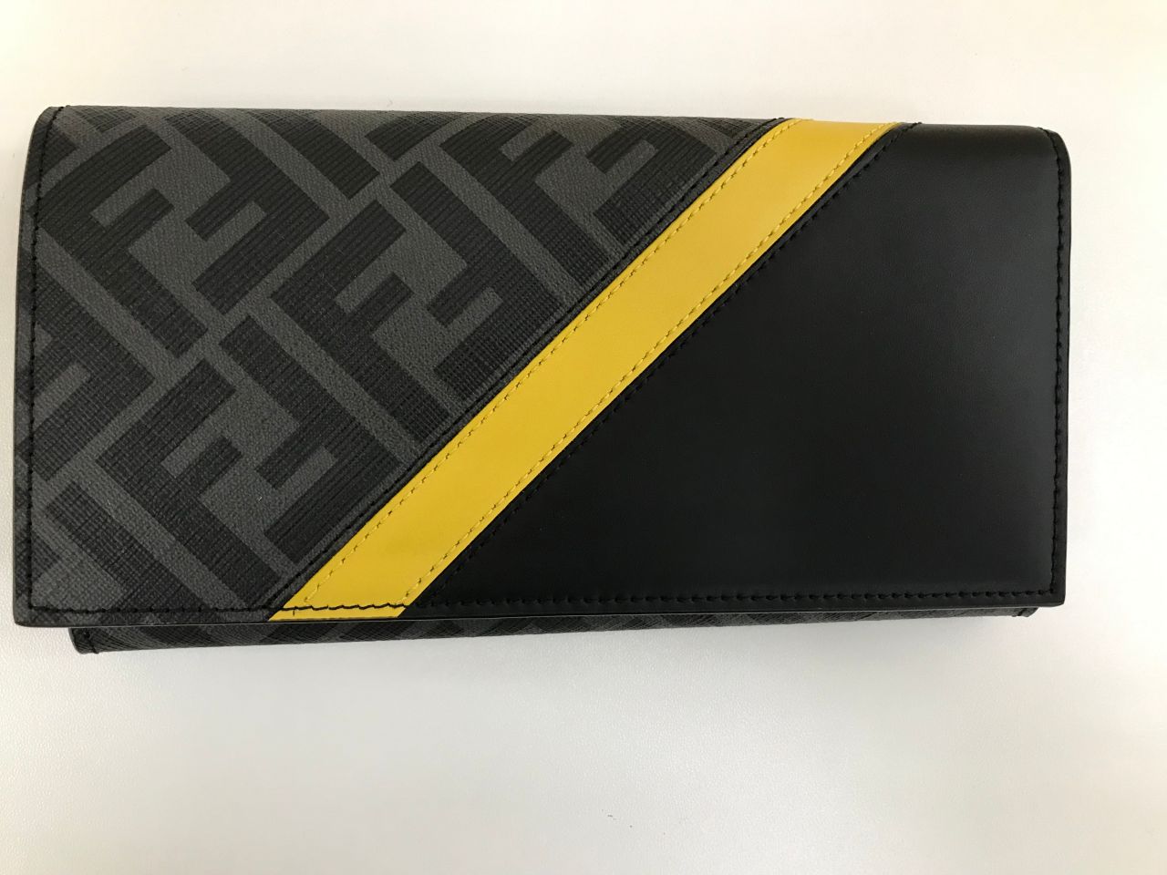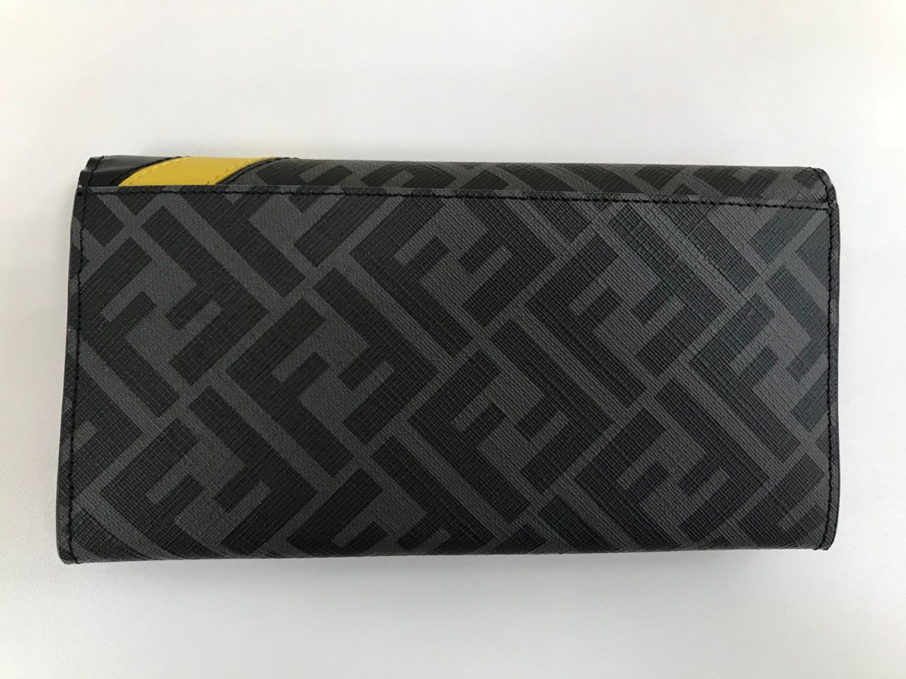 FENDIの代表的なビニールコーティングされたズッカ柄とブラックレザーの組み合わせ、イエローのラインが