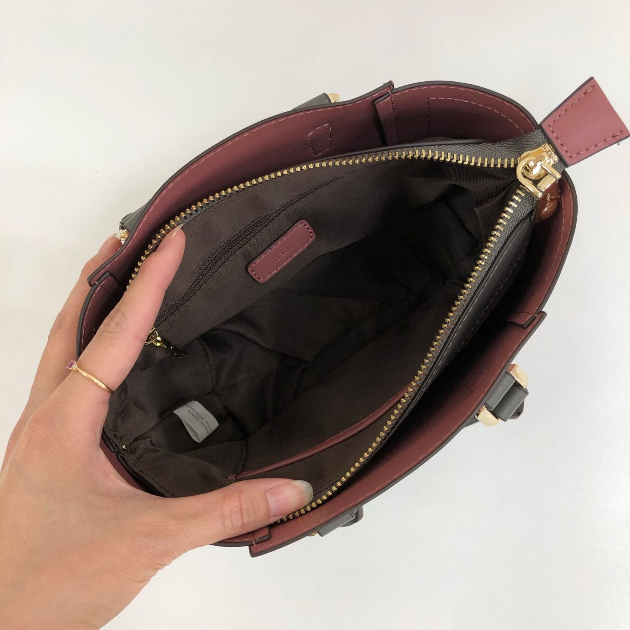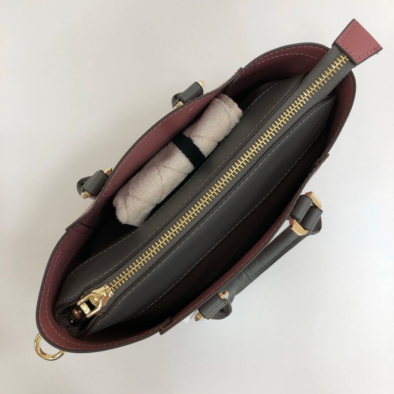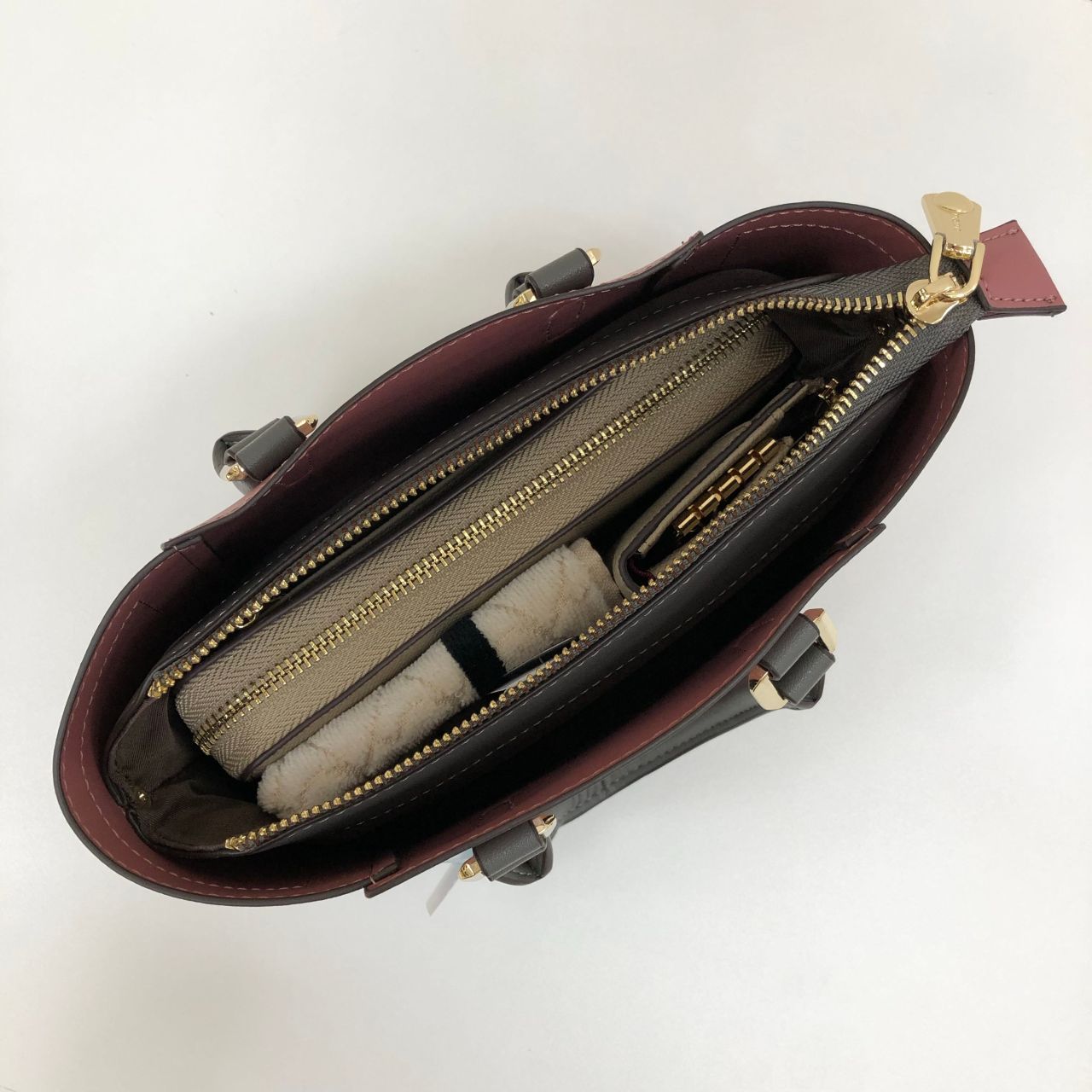 持っているとかなり小さく見えますが、二つ折り財布、キーケース、ミニポーチ、ミニタオルが入るほど使い勝手が良いです!!